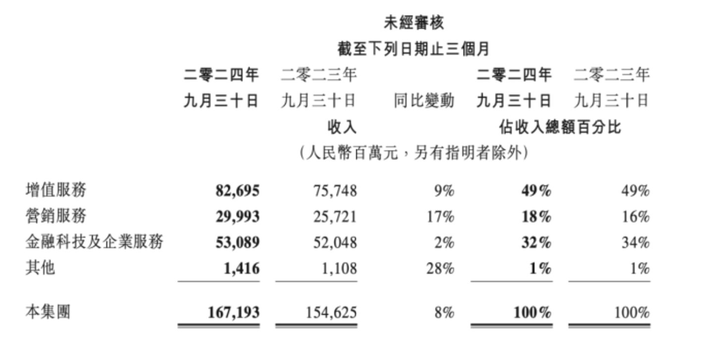 目前,营销服务收入虽然在腾讯占比最低,却是连续几个季度以来平均增幅最大的。财报称,该板块的增长主要受视频号、小程序、微信搜一搜广告拉动及AI技术应用。同时,企业服务业务受益于云服务和视频号商家技术服务费推动,毛利也有了显著改善。