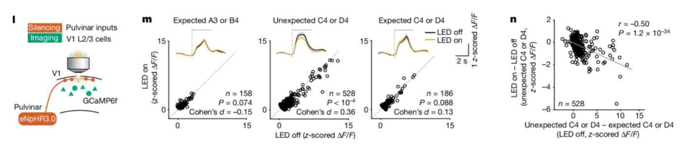为了理解大脑如何在视觉皮层中产生这种对意外感官输入的放大,研究团队使用了光遗传学的技术来灭活或激活不同组的神经元。他们发现了两组在视觉皮层中产生预测误差信号非常重要的神经元:在 V1 中表达血管活性肠多肽(VIP)的抑制性中间神经元,和一个称为丘脑枕的丘脑脑区。丘脑枕整合了来自许多新皮层和皮层下区域的信息,并与 V1 紧密相连。