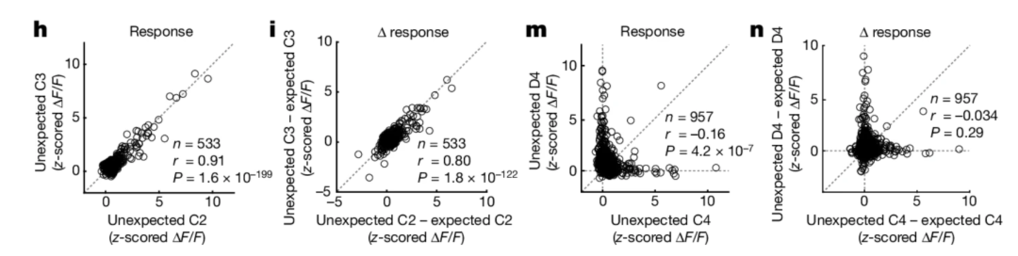 ▷图2:不同实验条件下,意外和预期 C2 之间的响应强度差异,与单个 V1 层 2/3 神经元的意外和预期 C3 响应之间的响应强度差异。
