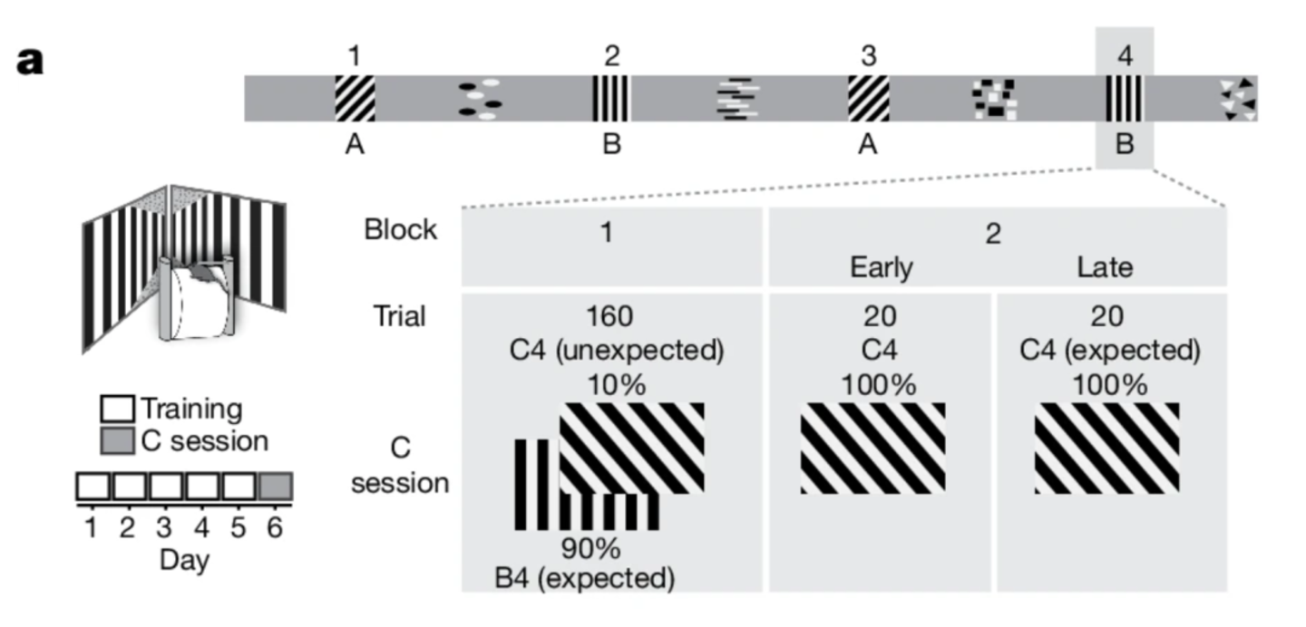 在这项研究中,研究人员将小鼠置于虚拟现实环境中,它们可以在熟悉的走廊中导航以获得奖励。虚拟环境使团队能够精确控制视觉输入并在墙壁上引入意外图像。通过使用双光子钙成像技术,研究人员能够记录来自初级视觉皮层(V1) 中第 2/3 层中许多单个神经元的神经活动。初级视觉皮层是大脑新皮层中第一个从眼睛接收视觉信息的区域。
