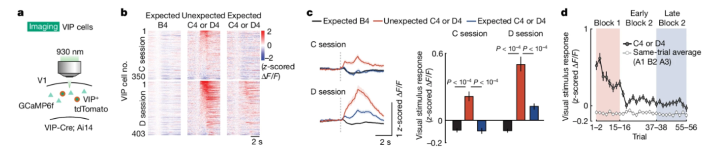 ▷图3:a, 双光子成像记录的实验设计;b, 所有记录的 VIP 细胞的单细胞层面对意外刺激的响应e, 实验设计,记录 VIP 细胞在视觉刺激呈现期间光遗传学沉默时V1 第 2/3 层细胞的钙活性;f, V1 神经元的顶部、细胞和试验平均反应对呈现的视觉刺激有显著反应。