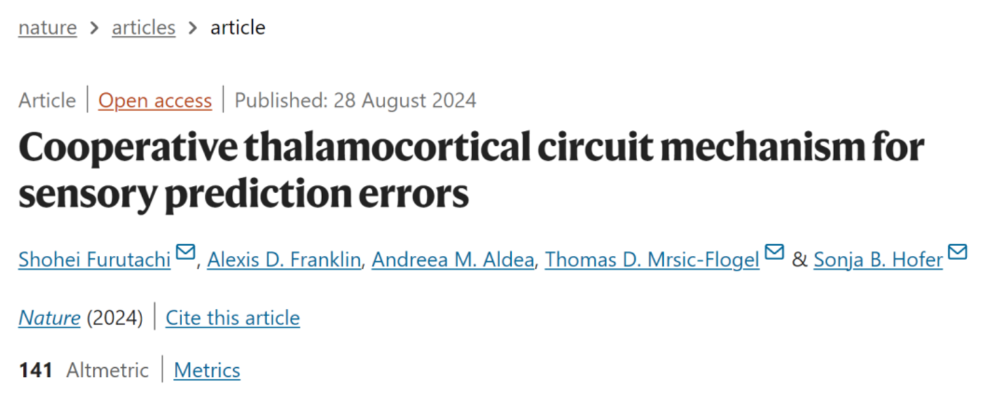 ▷Furutachi, S., Franklin, A.D., Aldea, A.M. et al. Cooperative thalamocortical circuit mechanism for sensory prediction errors. Nature (2024). https://doi.org/10.1038/s41586-024-07851-w