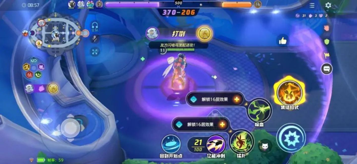 相比之下,《宝可梦大集结》对MOBA玩法进行了简化,上中下三路兵线被删去,装备和防御塔等MOBA游戏的常见要素也都消失不见。玩家要做的只有一件事,那就是击杀野怪或对手积攒亿奥斯能量,并在敌方得分区将亿奥斯能量投出去。