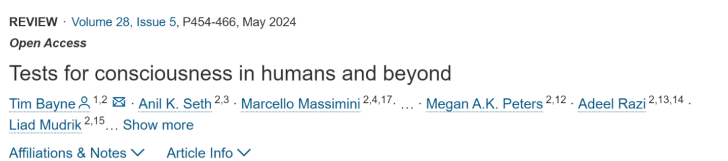[3] Bayne, Tim ; Seth, Anil K. ; Massimini, Marcello ; Shepherd, Joshua ; Cleeremans, Axel ; Fleming, Stephen M. ; Malach, Rafael ; Mattingley, Jason ; Menon, David K. ; Owen, Adrian M. ; Peters, Megan A. K. ; Razi, Adeel & Mudrik, Liad (2024). Tests for consciousness in humans and beyond. Trends in Cognitive Sciences 29.