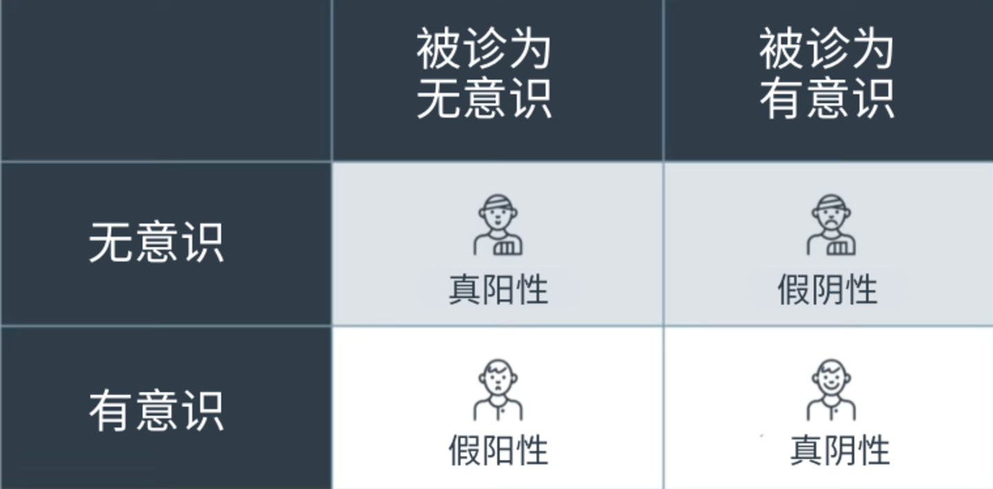 ▷示例,敏感性是指在无意识的人中,诊断正确的人有多少?特异性是指在有意识的所有人中,诊断正确的人有多少?更具体地说,假阳性是指被错误诊断为无意识的人;假阴性是指被错误诊断为有意识的人。