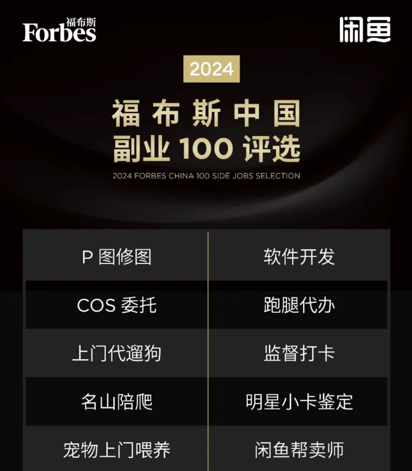 前段时间,福布斯中国联合闲鱼揭晓了“副业100”评选,盘点了时下最热门的副业商机。据悉,该榜单评选标准是根据闲鱼近一年的副业交易数,同时参考市场规模、需求数量搜索、支付总额和订单数量等指标,旨在揭示当前最具潜力和增长势头的副业领域。