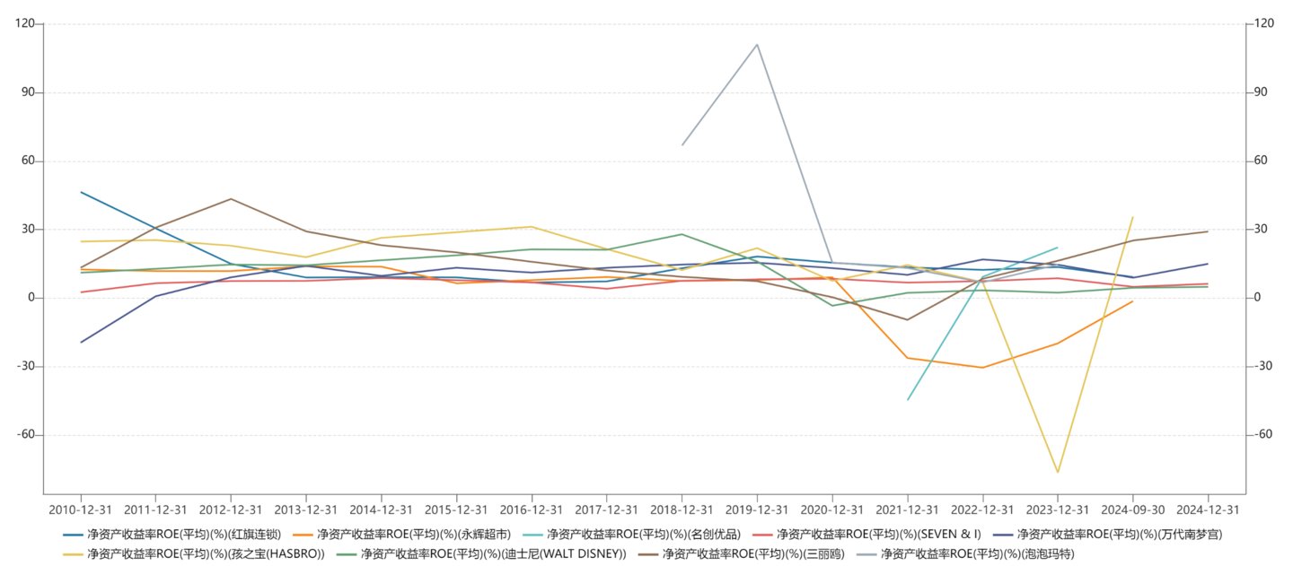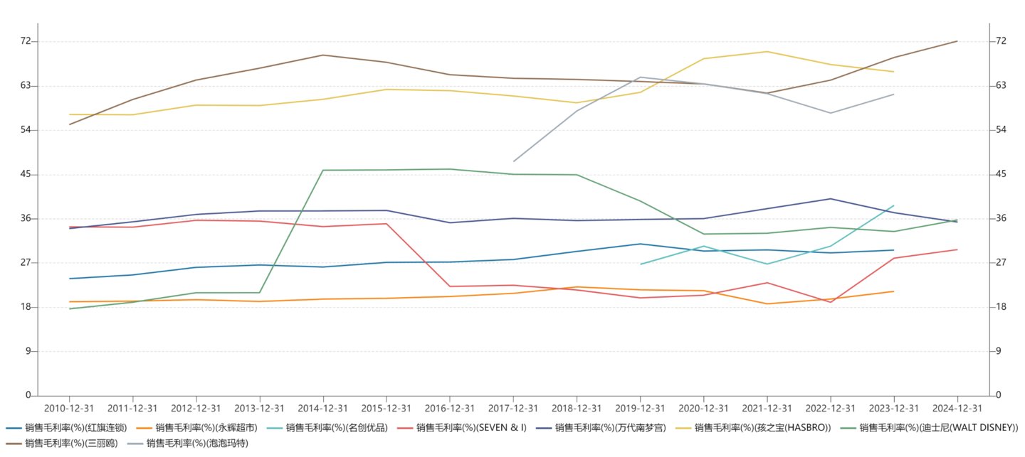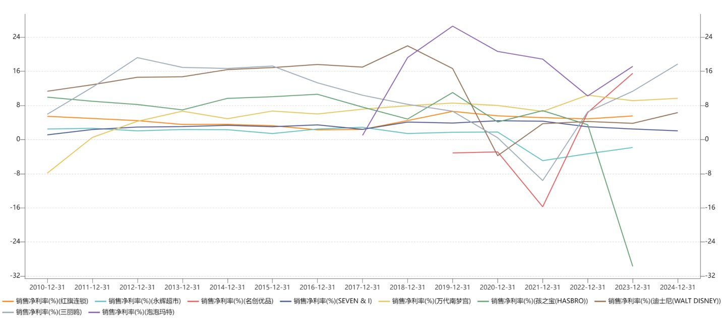 假设我们站在第一层商业模式的角度来理解,那我们就给予它“零售超市”的估值,可比对象是名创优品、SEVEN & I(也就是711的母公司)、永辉超市、红旗连锁这些,它们没有自己的IP或者说只有弱IP,侧重点还是在零售上面。