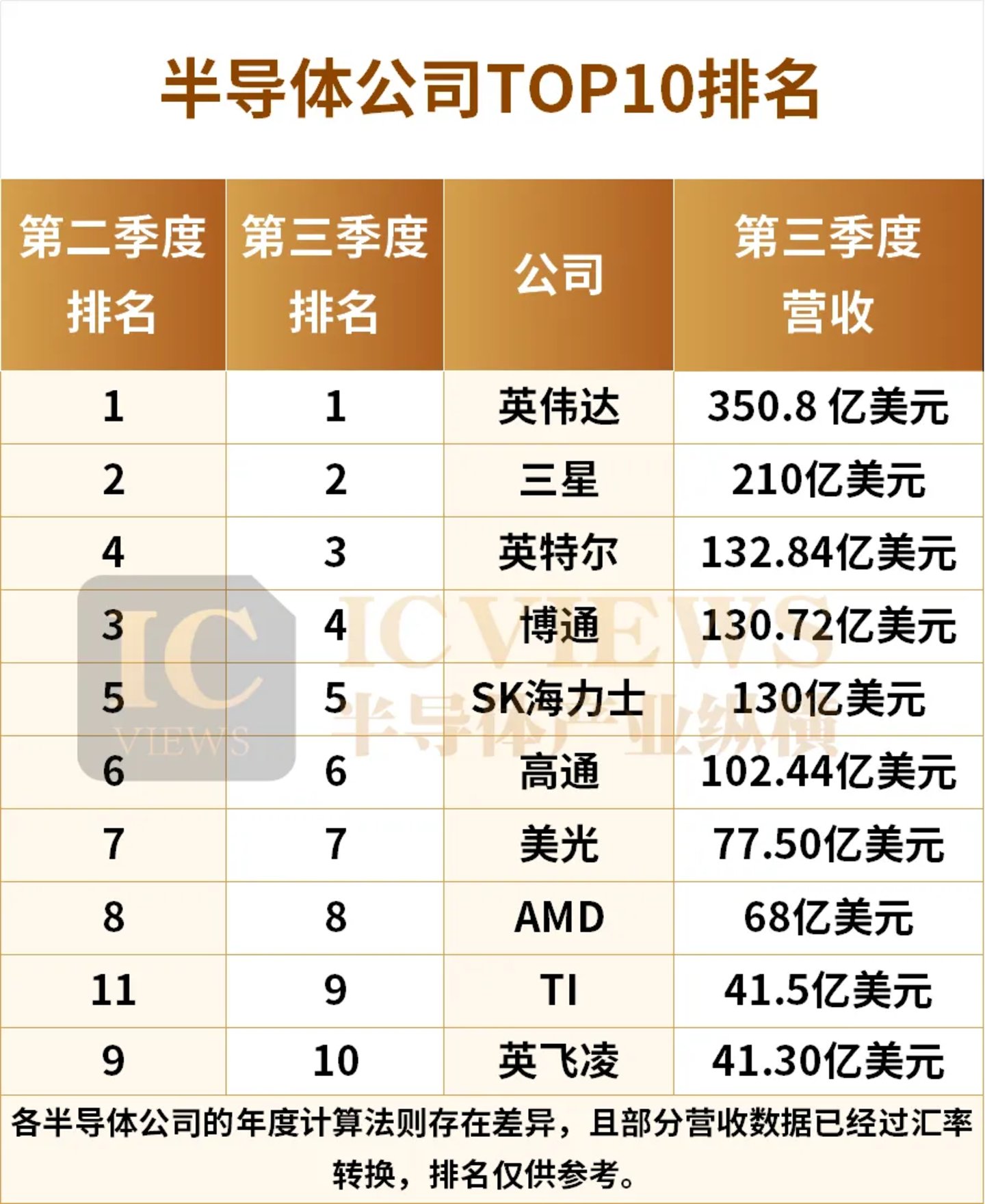 据此观察,依据各大半导体领军企业最新公布的业绩数据,全球半导体厂商TOP10的排名已有所调整,最新计算准则下的排名应如下所示: