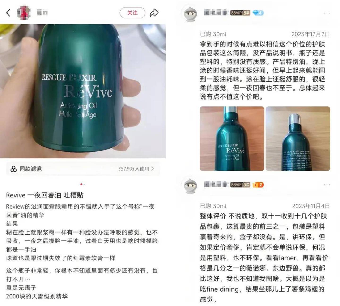 不过,也有不少用户认为产品使用感惊艳,抹开即化、使用后感觉整张脸都在发光、“没用过一夜回春油,就等于没用过RéVive”。