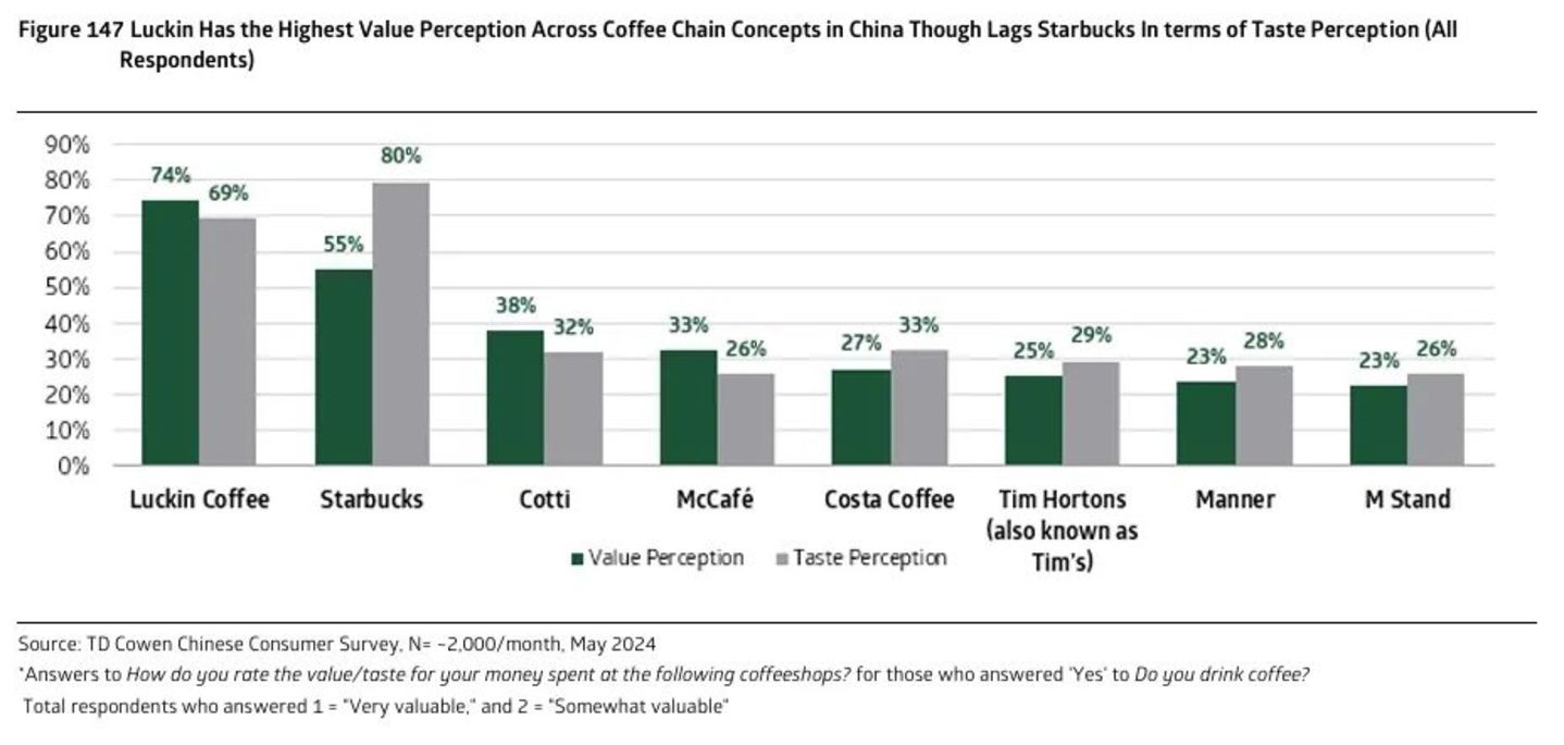 而且,尽管瑞幸来势汹汹,搅动了整个咖啡行业,在消费者中的价值认知度也最高,但口味上仍显著落后于星巴克。[6]