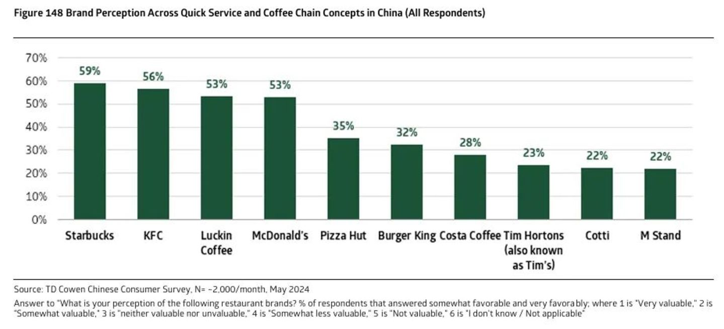美国知名投行TD Cowen 今年5月的研究 发现,在中国快餐服务和咖啡连锁品牌中,星巴克的认知程度仍稳居第一。[6]