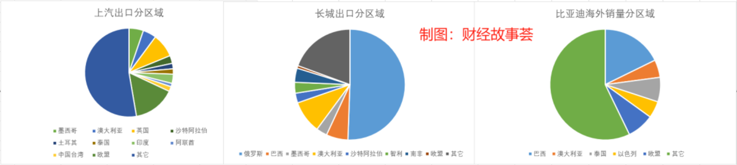 不同区域的出口形势不同,对车企的影响也不同。我们选取比亚迪、上汽、长城三家公司的出口数据做对比,分别代表新能源车龙头、合资品牌龙头和自主品牌出口量大车企。