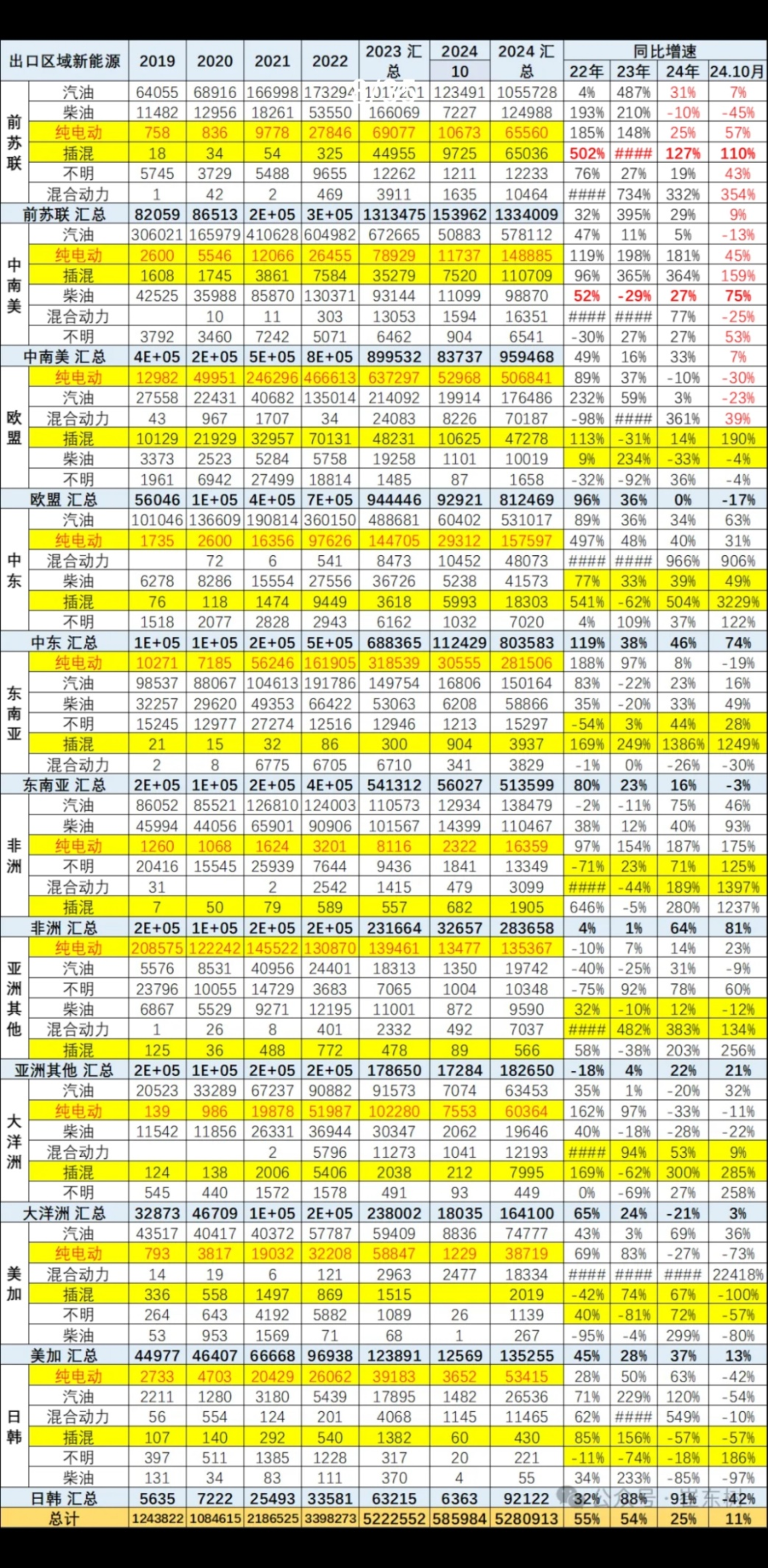 从纯电动车出口来看,出口较大的地区有欧盟、东南亚、中东、中南美地区,出口量分别是50.7万辆、28.2万辆、15.7万辆、14.9万辆。其中向欧盟和东南亚是我国出口的电动车两大市场,分别占出口的37%和20%,今年1~10月对欧盟出口电动车增速0%,对东南亚出口增速8%,均有大幅放缓,虽然中东和中南美地区实现了增长,但整体新能源出口增速大幅放缓了。