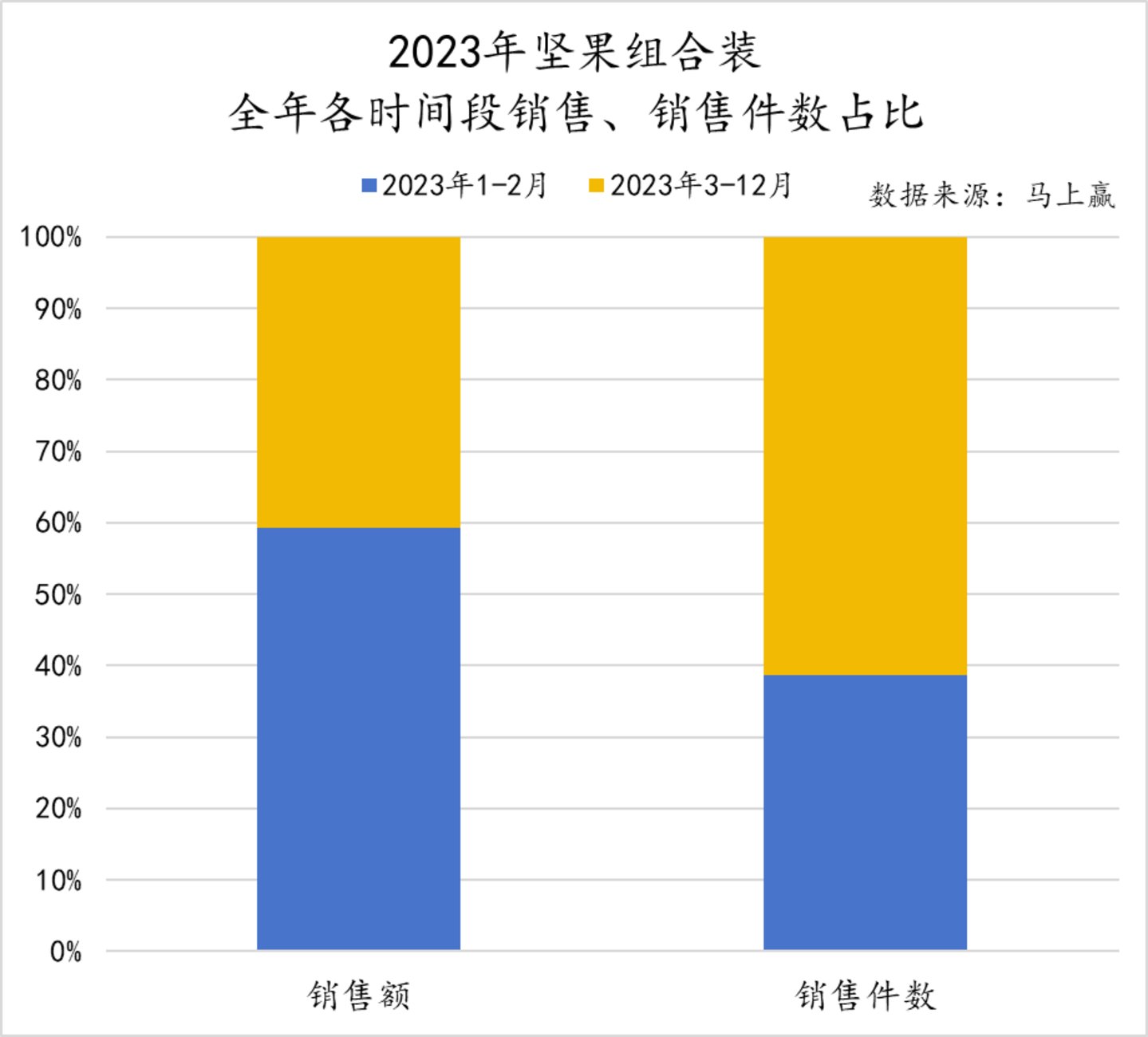根据快消行业大数据公司“马上赢”的线下零售监测网络数据,包括坚果礼盒类产品在内的坚果组合装,在2023年1-2月期间的销售额占据了全年销售额的60%左右,销售件数也占据了近40%。马大姐食品CCO杨学宝在接受采访时称,2021年春节,除夕前两个月的销售额占到马大姐全年销售额的50%左右,此前,同时间段的销量一度占到全年的六成。