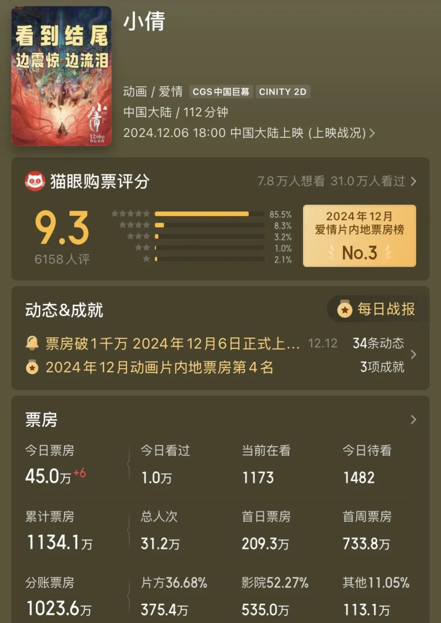 忧的是,同时拥有彩条屋影业和光线动画两大动画厂牌的光线传媒,动漫产业的发展却并不乐观。光线传媒能在2024年前三个季度实现盈利,主要因为春节档押中了《第二十条》,但在动漫业务方面,彩条屋出品、年初上映的水墨国风动画电影《大雨》票房不到两千万,而近期正在线下院线上映的《小倩》同样票房惨淡,上映九天累计票房仅仅只有一千万。而《小倩》失利带来的负面影响远比《大雨》要大。