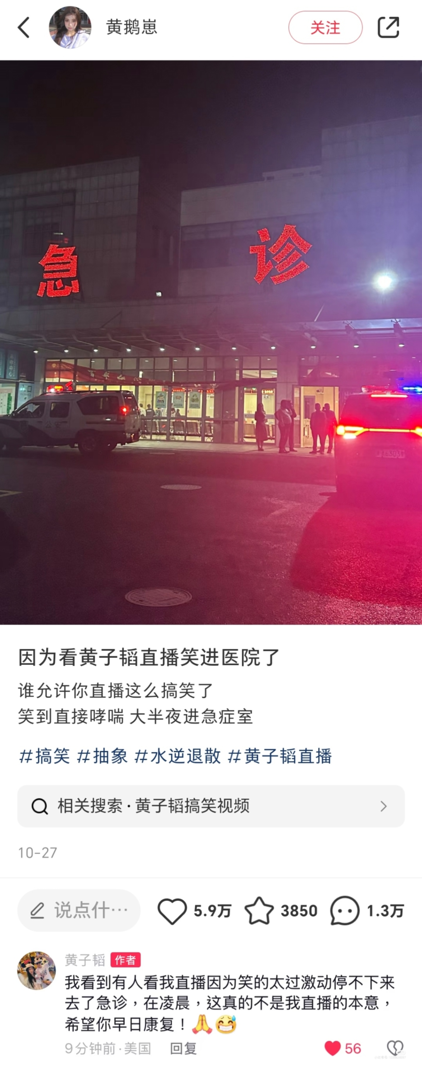 更有网友称自己半夜看黄子韬直播,笑到哮喘发作直接进了医院,该笔记在小红书获赞5.5万,评论区变成了黄子韬直播交流大会,还有网友建议去找黄子韬报销医药费。黄子韬的回复也充满了“抽象”,“这本不是我直播的本意,希望你早日康复。”