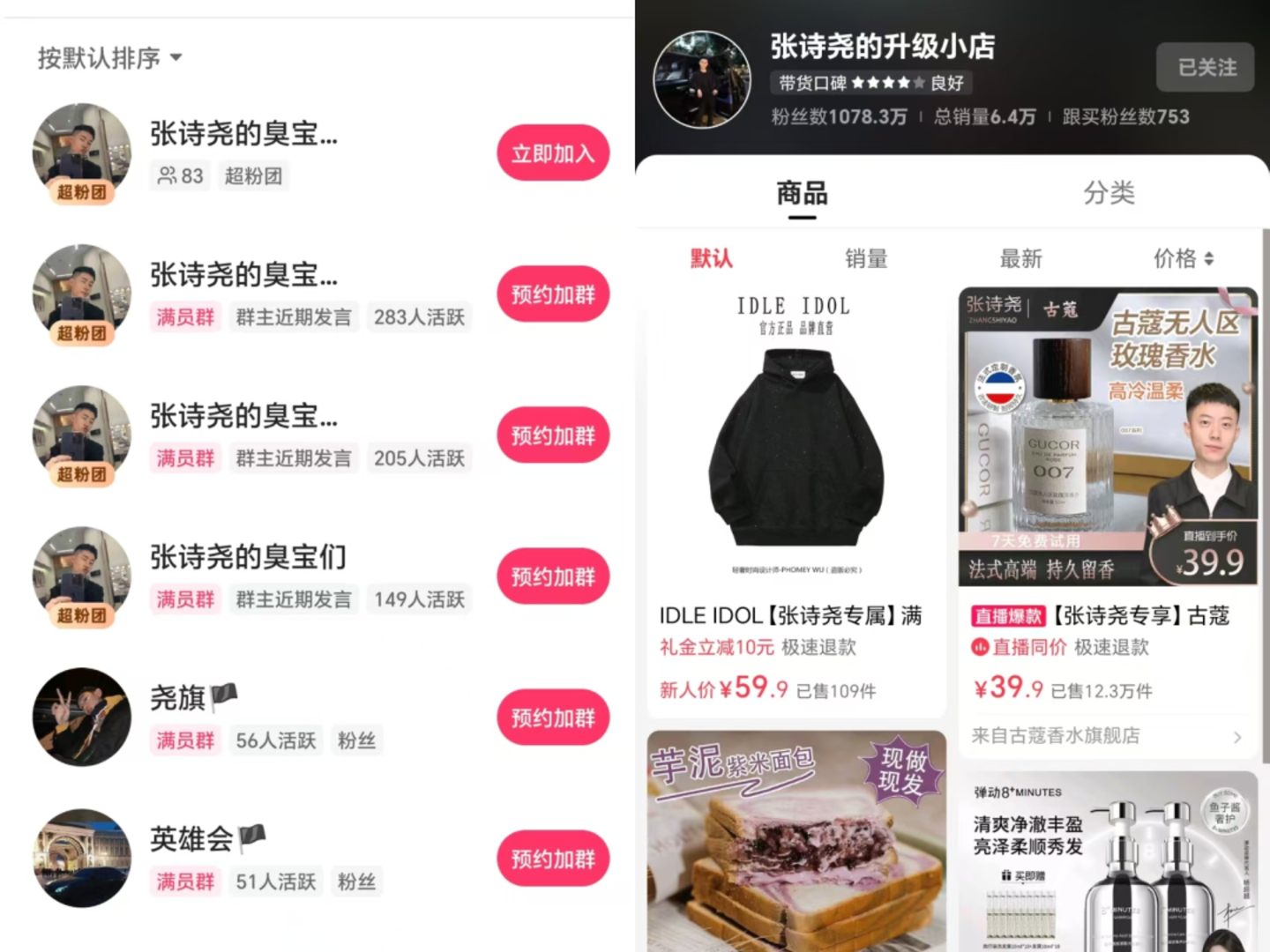 剁椒Spicy观察到,在“张诗尧的升级小店”中挂有多个标有“张诗尧专属”的商品链接,且均为白牌商品,比如39.9元的古蔻香水、59.9元的IDLE IDOL 卫衣。其快手小店总销量为6.4万,跟买粉丝数为753人。
