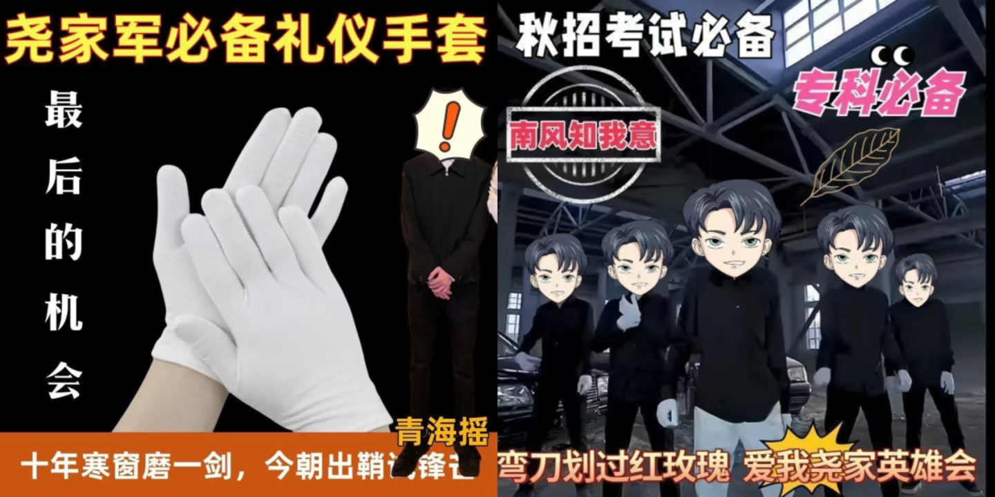 在电商平台搜索“秋招”,甚至会弹出青海摇标志性装备“白手套”相关产品。“摇子秋招”的抽象文化也深度感染到了手套商家,有网友在电商平台上询问客服,“这个符合考试标准吗?”客服回复称,“符合秋招,弯刀划过红玫瑰,爱我尧家英秋雄会,亲,符合标准用的哦,祝亲顺利成功上岸。”