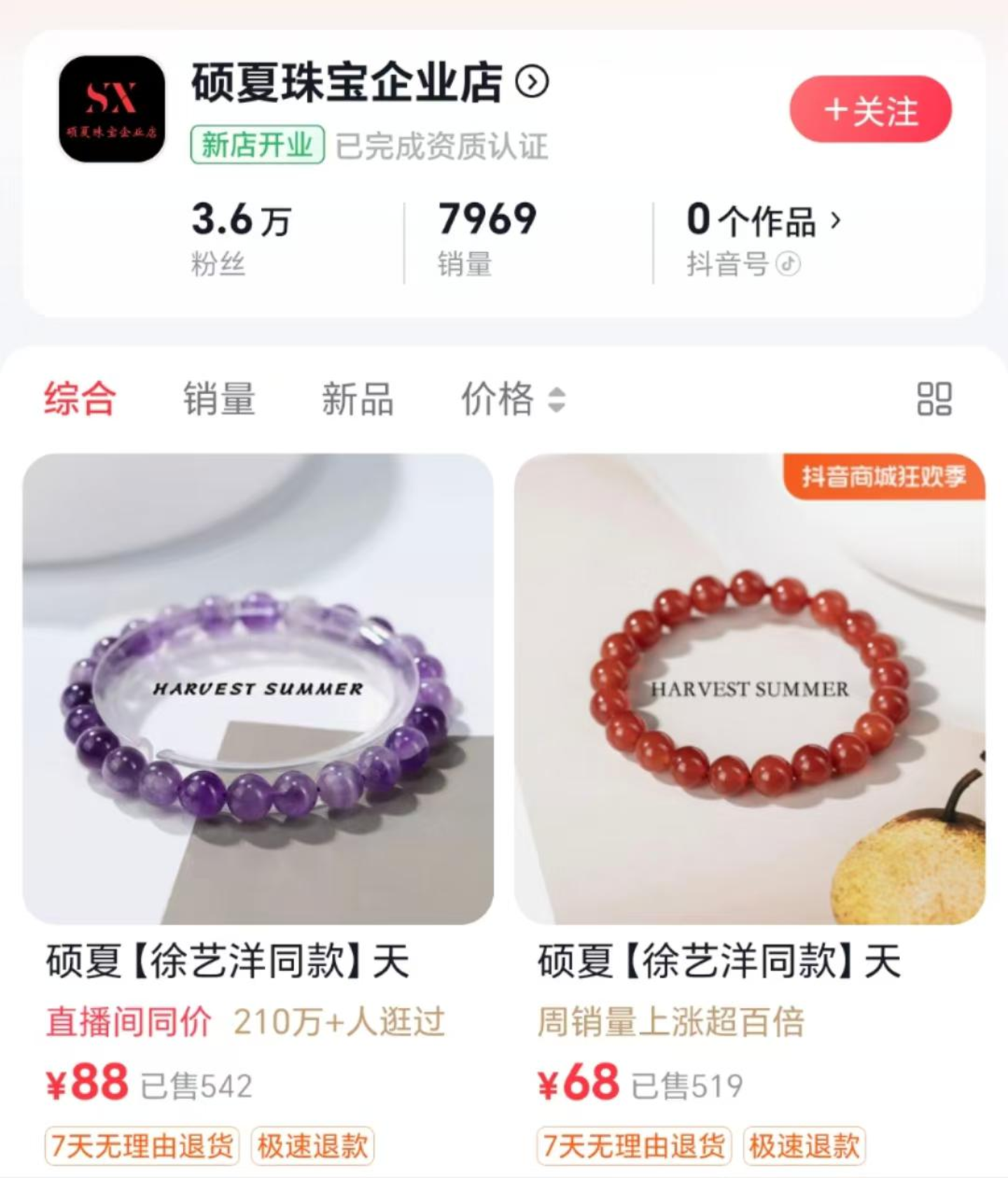 事件女主角徐艺洋也如预期在12月10日开启了直播带货,带货品类是水晶,价格从68元到2998元不等。根据蝉妈妈平台数据,这场名为“水晶之约”的直播,时长1小时54分,观看人次为1402.6万,销量在5000到7500件,销售额预计在100万到250万之间,其上架商品主要品牌是一家名为“硕夏”的珠宝企业,其抖音店铺信息显示,当前销量已达7969件,有3.6万粉丝。