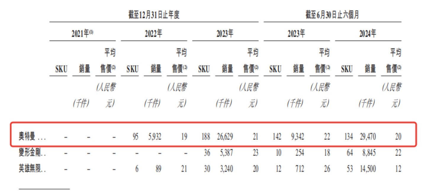 但到了2023年,奥特曼销量达到2663万件,是上一年的4.5倍。2024年上半年,奥特曼销售达到2947万件,已超过2023年全年销量。