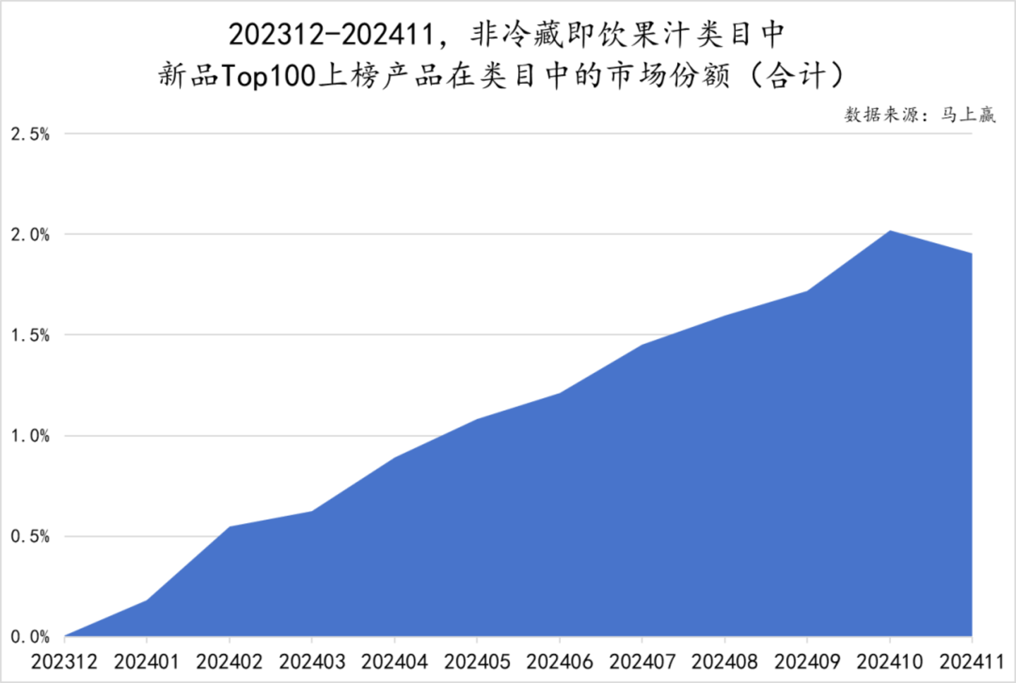同样是从2023年12月开始便有所发力,非冷藏即饮果汁赛道中新品所占份额却与即饮茶类目相差甚远,在新品合计市场份额最高时也仅有2%左右。如此市场表现则说明该类目内的新品虽来势汹汹,但目前在类目中带来的影响并不算大,也并未对传统产品造成较大的威胁。