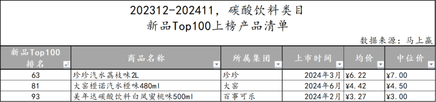 对比植物饮料、气泡水等类目,碳酸饮料显然是饮料赛道中的“老前辈”。在这一传统类目中,过去一年仅有3款新品进入TOP 100 SKU,珍珍、大窑、百事可乐旗下各有1款,且在新品销售额排名上均相对靠后。