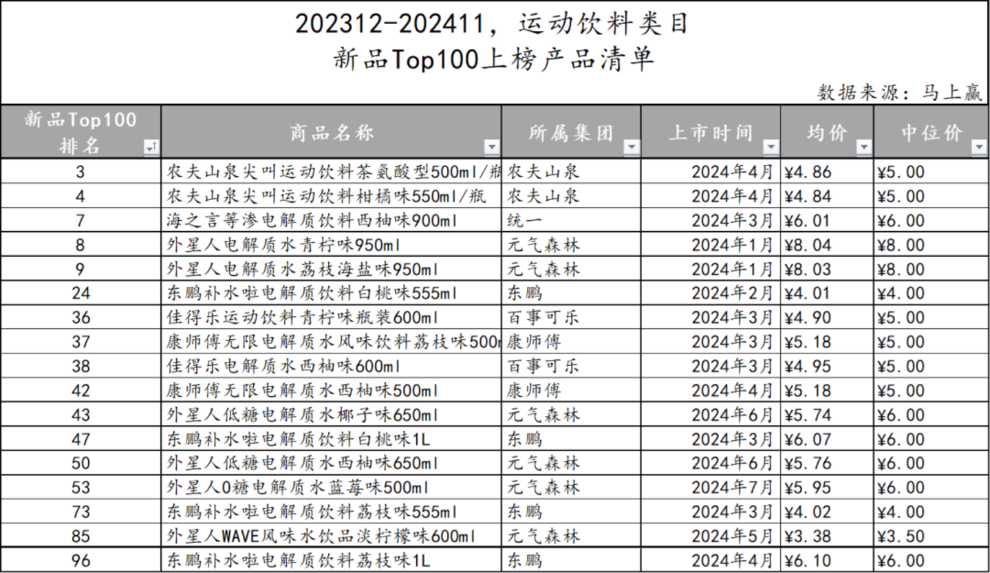 对比2023年盘点时的数据来看,运动饮料类目的发展势头更加迅猛,在高质量新品的助力之下便也不难理解其市场份额同比的高速增长了。冷藏即饮果汁与气泡水类目下均有6款新品位列TOP 100,同比来看产品创新与新品现状也表现较好。