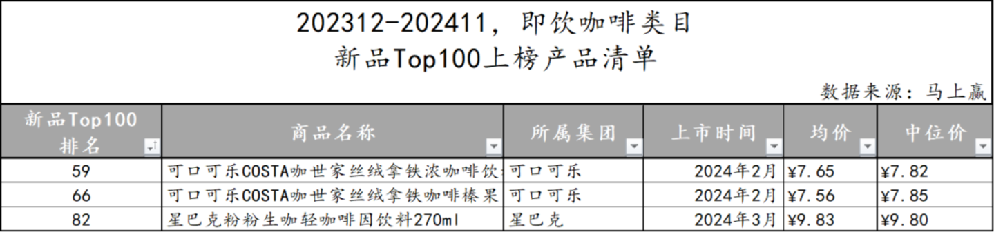在类目整体发展较为艰难的背景下,类目内能够进入TOP 100之列的新品数量也十分有限,仅有可口可乐旗下的2款以及星巴克旗下的1款产品入列。