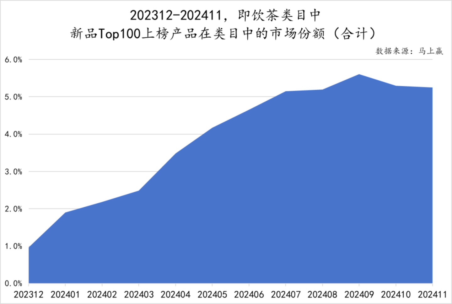 即饮茶类目中,新品TOP 100 SKU所占的市场份额在2023年12月便已有1%左右,随后一路波动提升并在今年9月份达到5.5%左右的最高值。从中可见该类目下的新品在市场内有持续发展的潜力,能够在相对平缓的节奏下接棒成熟产品的市场份额,对类目整体而言是不可或缺的新生力量。