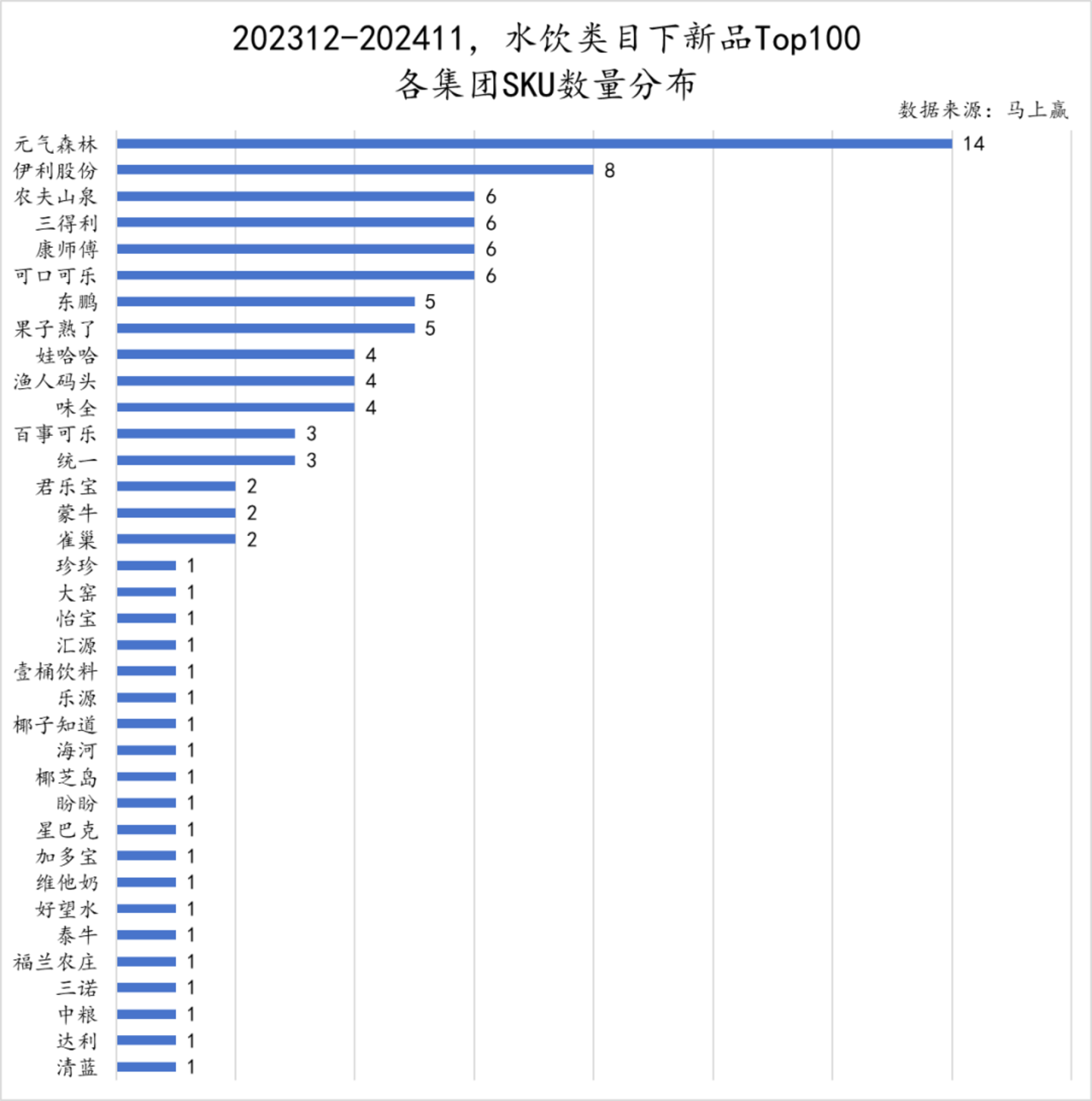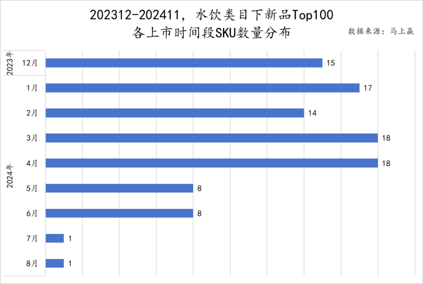 一方面,针对TOP 100 SKU的统计方法而言,在统计周期内越早发布的产品便越有空间在市场中站稳脚跟,日积月累之下市场份额相对较高也不难理解。而另一方面,水饮企业也惯于在夏季,即销售旺季来临之前大规模推出新品,以便在激烈的市场竞争中夺得先机。