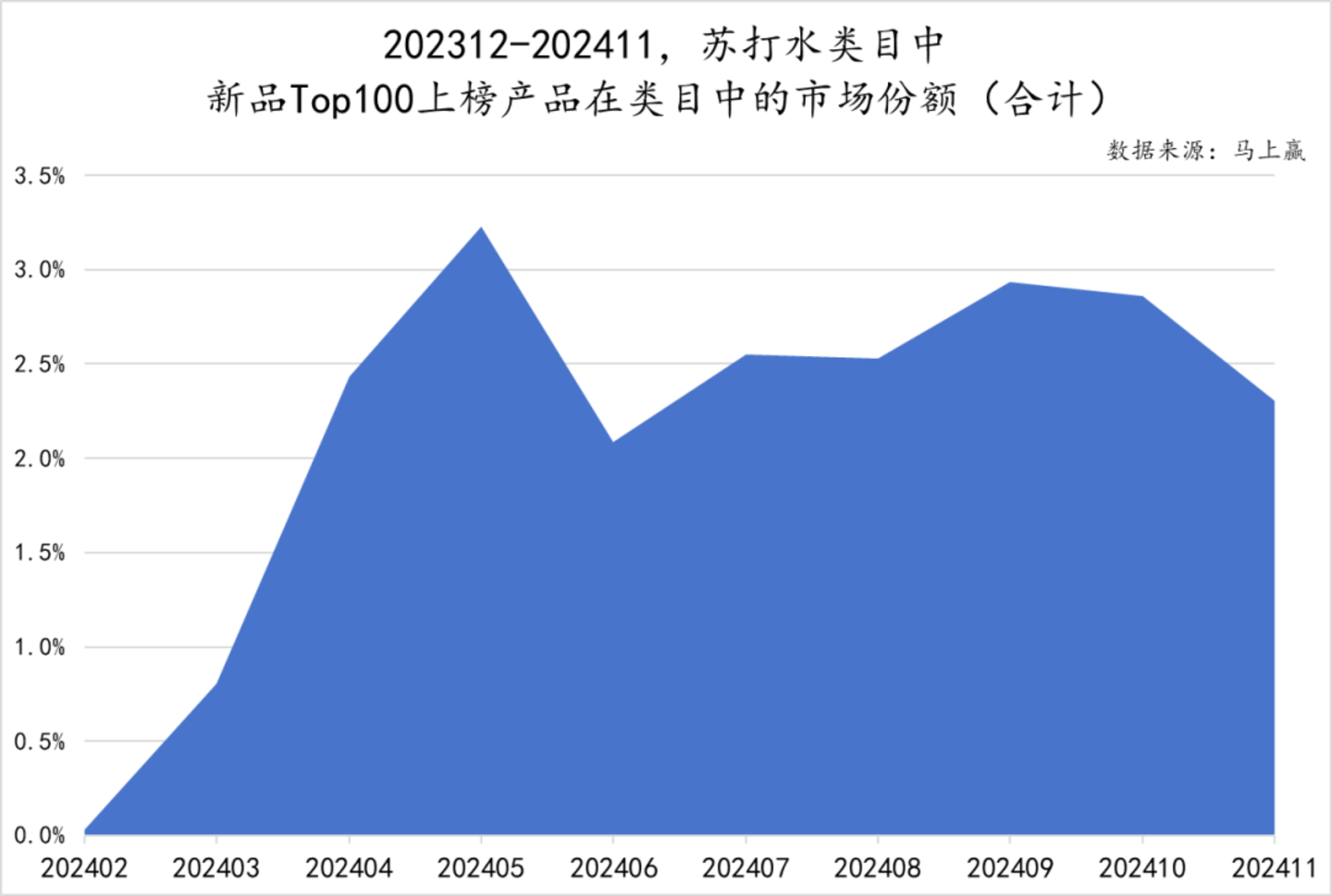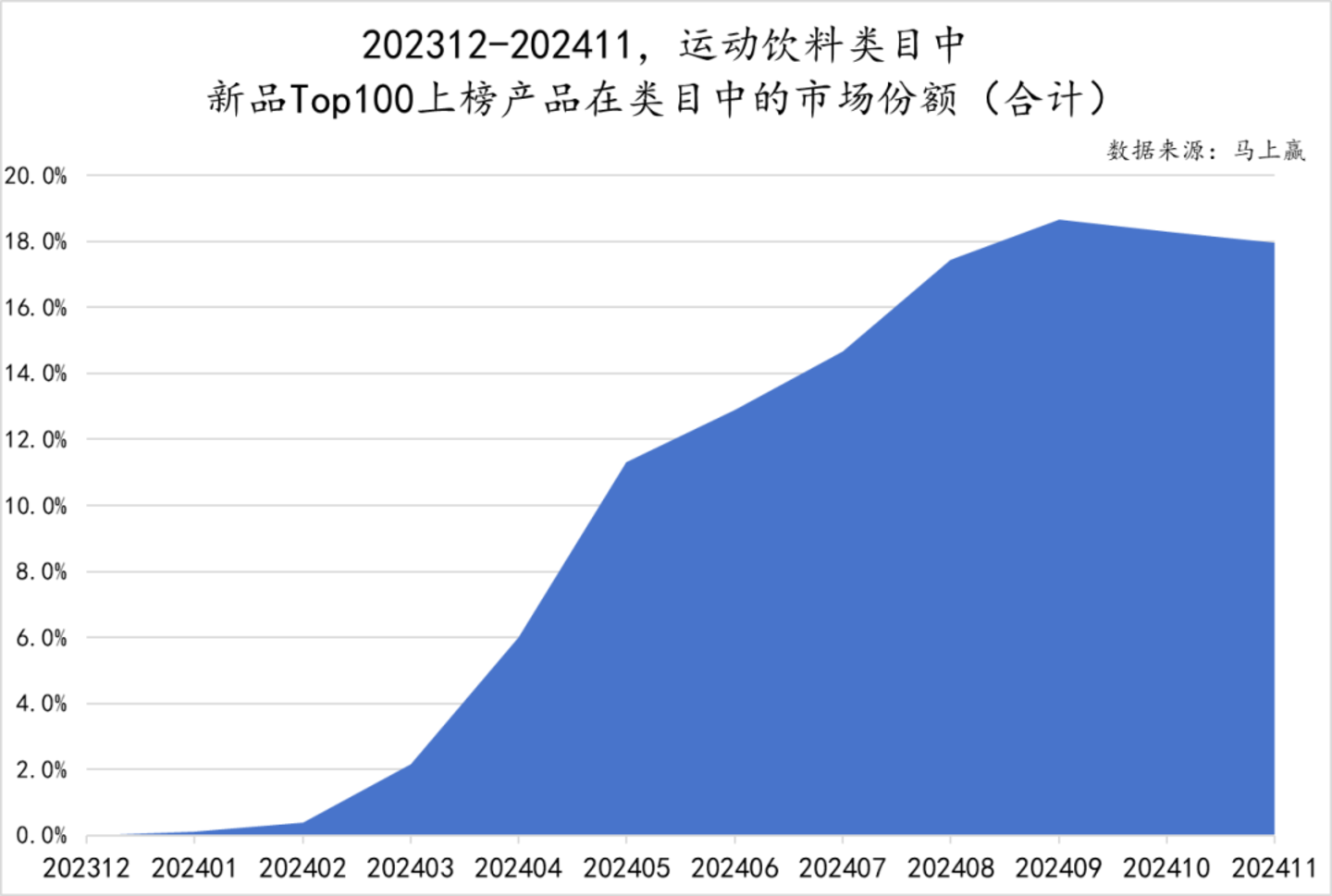 从新品TOP 100 SKU在类目内的合计市场份额走势来看,运动饮料类目下的新品-老品结构仍处在快速调整迭代的过程中。可以看到,该类目下新品的市场份额合计数值从2024年2月开始持续攀升,2024年9月开始便稳定在18%左右,新品在类目中占有的市场份额远高于其他类目,这也意味着新品能在较短的时间内接管原有产品的市场份额,或者是有足够的能力与原有产品共同做大蛋糕。