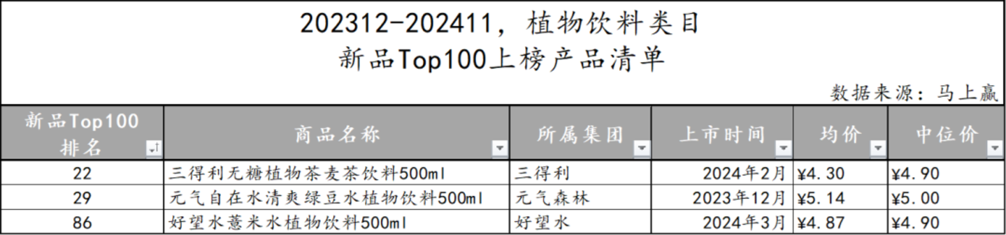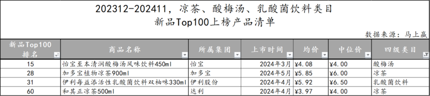 在对TOP 100 SKU的新品类目归属梳理之后,可以看到,植物蛋白饮料、能量饮料、营养素饮料、即饮奶茶四个类目下并无新品进入TOP 100 SKU行列。