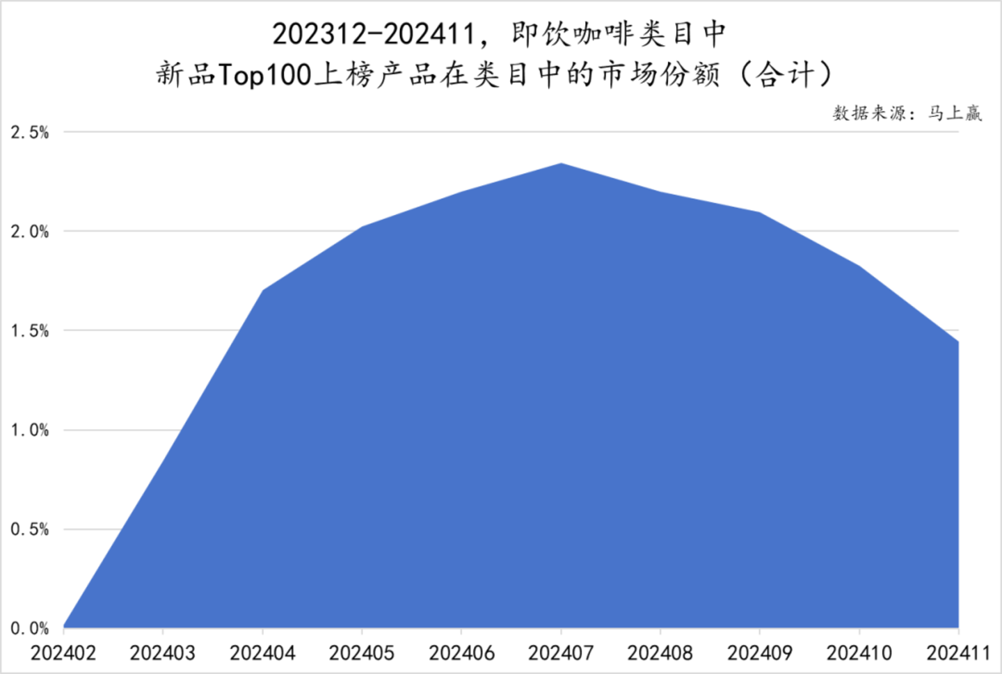 但并不乐观的的是,该类目下新品的市场份额在2024年7月便已经达到了峰值,随后三个月便接连下跌至1.5%左右。尤其是在即饮咖啡相对销售情况更好的秋冬时节,新品市场份额并没有进一步拉升而是掉头向下,这几款新品是否能有较长的生命周期还需要打一个问号。