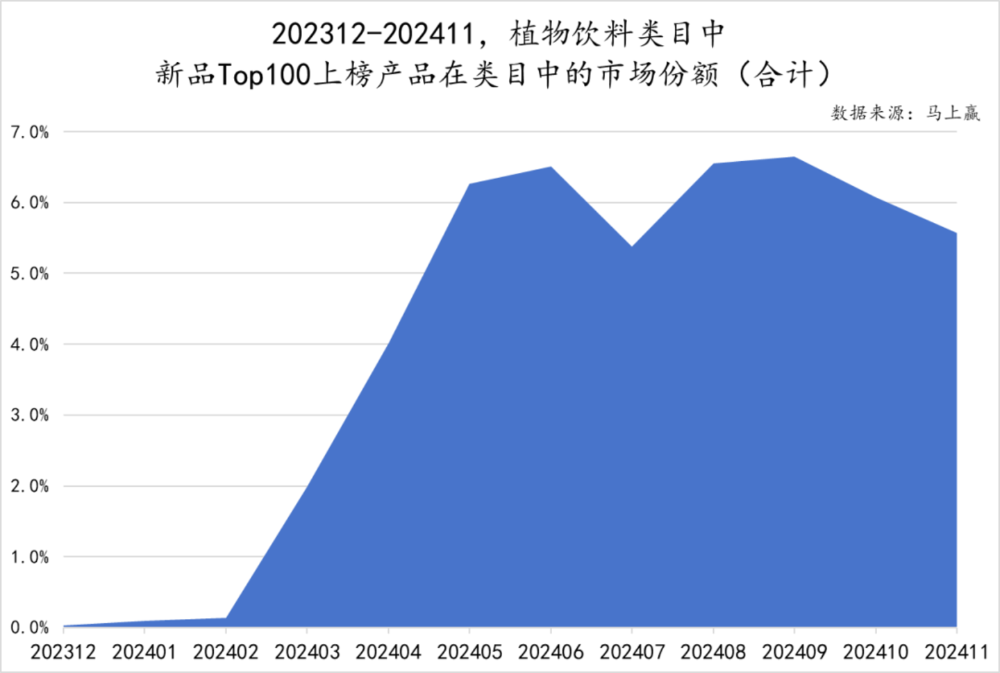 走势上看,植物饮料类目下新品的市场份额增长曲线陡峭,成长速度较快;绝对值上看,该类目整体的市场份额虽相对较小,但新品上市后仍有可能后发制人,在市场中抢占一席之地。由此看来,植物饮料类目整体处在快速上升通道之中,市场与消费者对新品都更为包容,值得各家企业的高度关注以及持续投入。