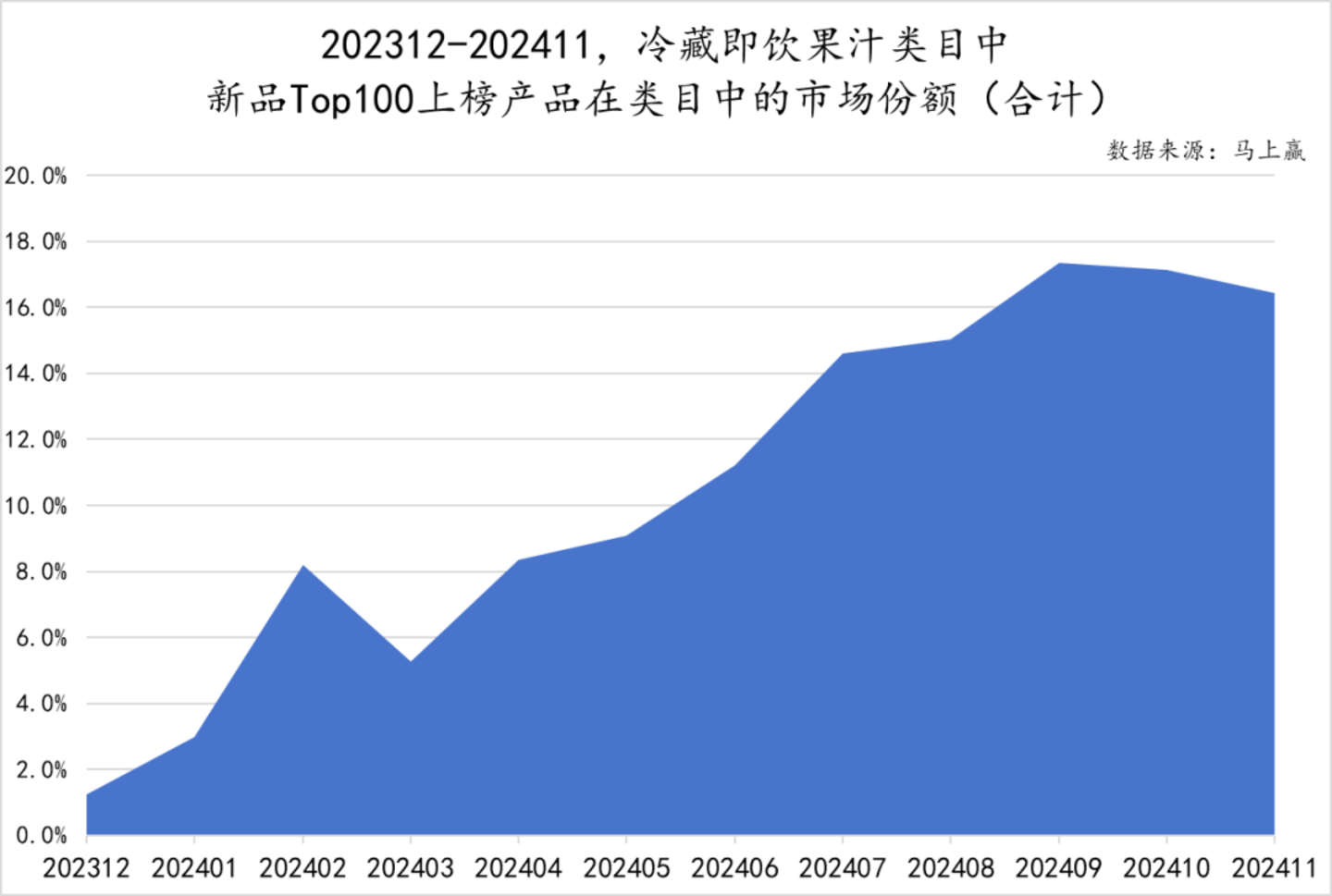 冷藏即饮果汁类目下的新品数量虽不算多,但其在类目市场内的影响力却相对较高。从市场份额数据来看,新品TOP 100入列产品在类目内的市场份额一路走高,尽管受春节影响在2月出现一次高峰后便有所下跌,但其持续提升的趋势却并未停下,截止至2024年11月已稳定在18%左右。在市场规模相对较小、仍处在快速发展阶段的冷藏即饮果汁类目中,新老产品之间更替的节奏也更快。