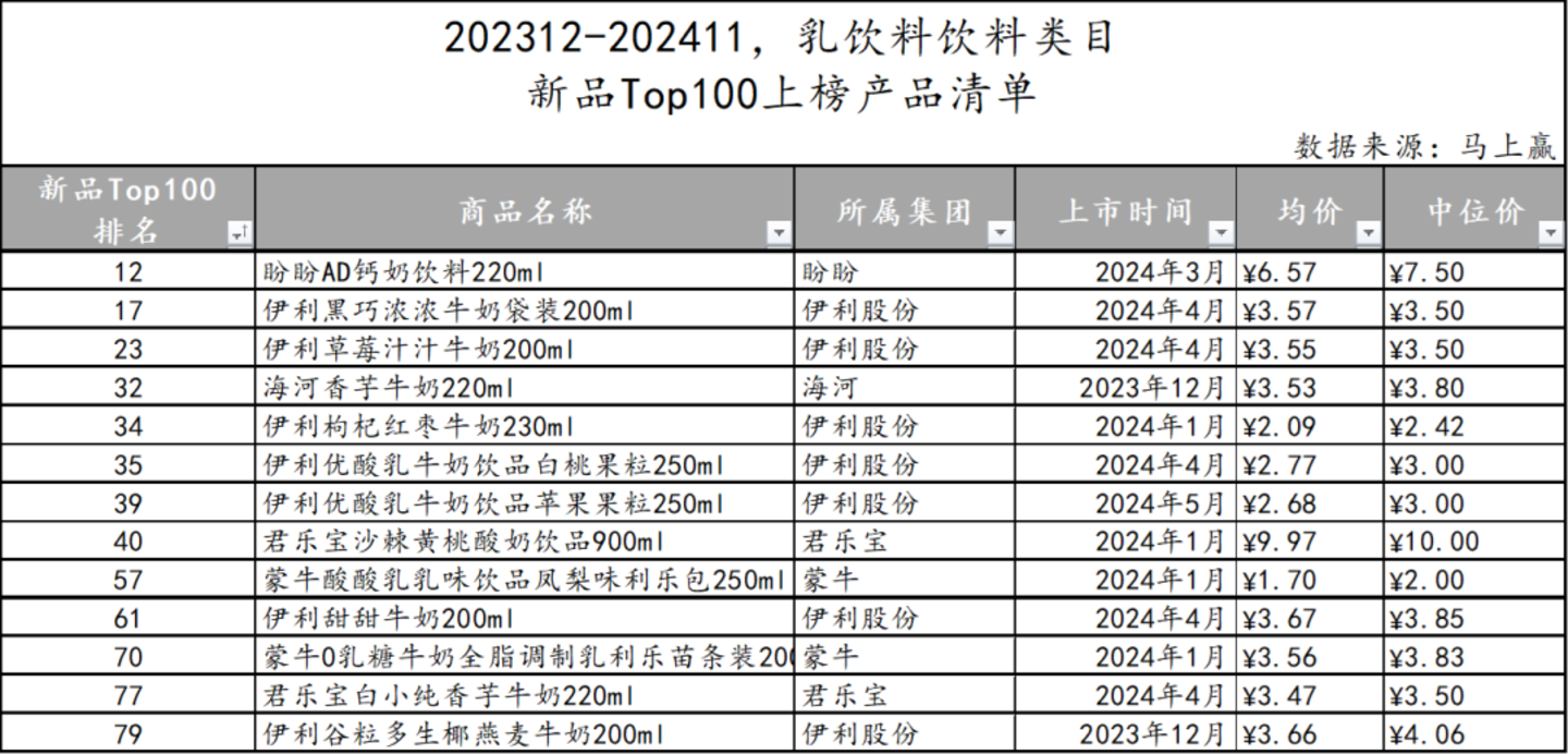 乳饮料类目内TOP 100的新品数量与非冷藏即饮果汁类目不相上下,共有13款。图中可见,13款中有超过半数均属于伊利股份旗下,侧面体现出该集团在乳饮料类目中的根基之深厚。此外,受海河影响而热度渐高的花色牛奶风潮也对乳饮料类目有一定影响,该集团旗下的香芋牛奶排名也较为靠前。
