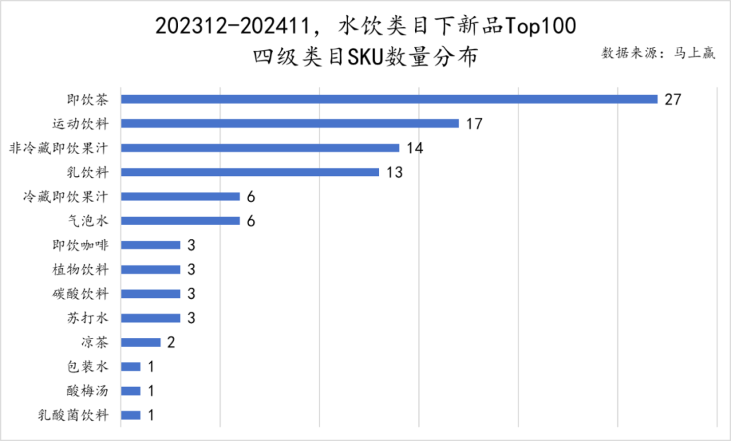 在大热的即饮茶类目下,位列TOP 100 SKU之列的新品共27款,占比超四分之一。