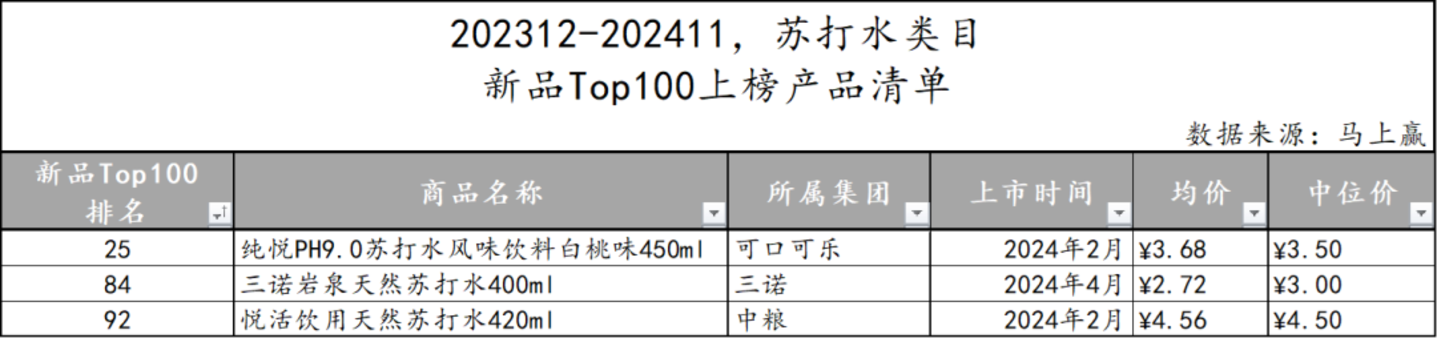 苏打水类目下进入TOP 100 SKU之列的新品同样仅有三款,分属于可口可乐、三诺、中粮旗下。其中,可口可乐旗下的纯悦PH9.0苏打水风味饮料在可口可乐品牌影响力以及白桃口味创新的加持下排名较为靠前,其余两款产品则均为天然苏打水。