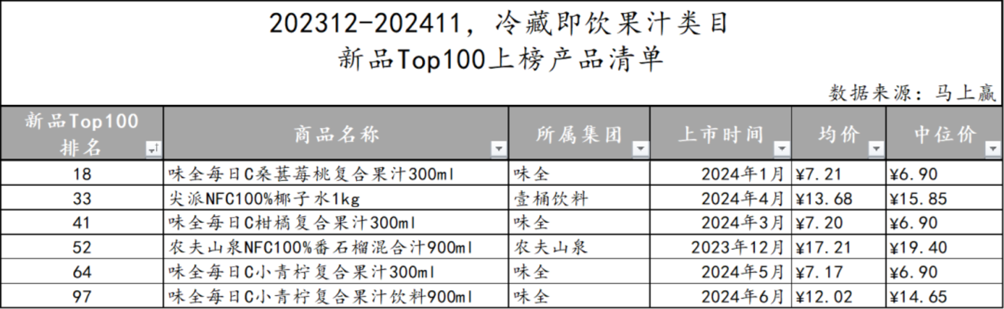 在第二梯队内,各类目的入列新品数量明显更少一些。冷藏即饮果汁类目下,位列TOP 100的新品共6款。其中,味全旗下共有4款产品入列,口味多样性更为丰富,同时也兼顾了消费者对大规格产品的需求。而壹桶饮料、农夫山泉旗下入列产品则均为900ml的大规格产品,可见在产品件均价相对较高的冷藏即饮果汁类目下,大规格产品的高性价比对消费者而言有较高的吸引力。