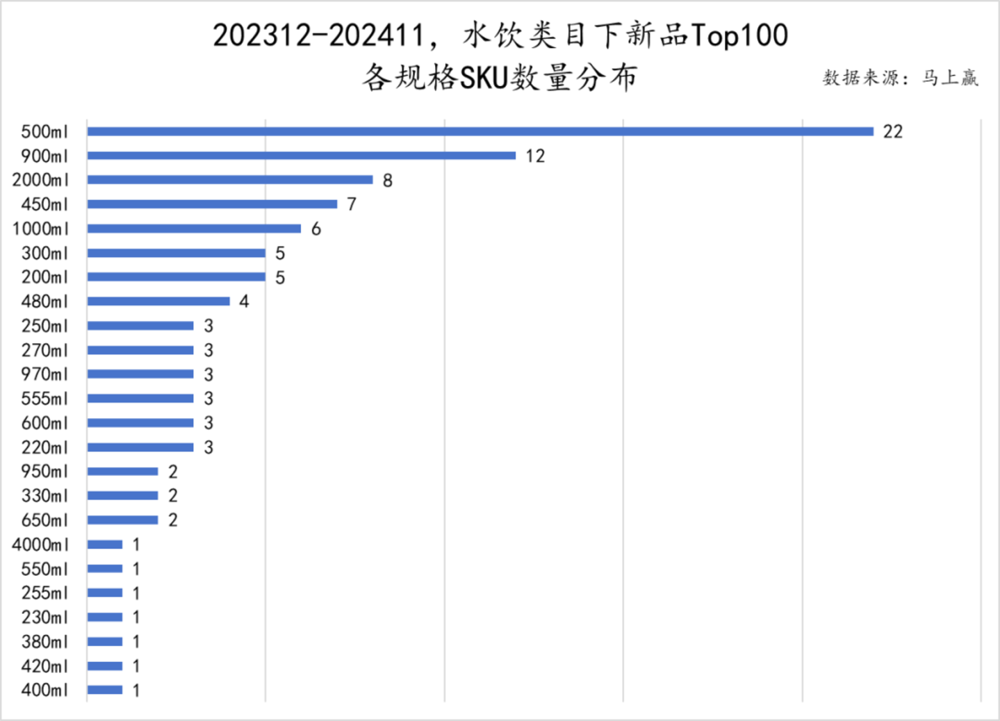 基于各规格的SKU数量分布,饮料市场中最常见的500ml规格下SKU数量不出意料地排在第一位,达到了22款。然而,不同于2023年盘点数据的是位于第二、三位的900ml、2000ml均为大规格,分别有12、8款新品跻身TOP 100 SKU之列,饮料大类中的大规格风潮还在继续。
