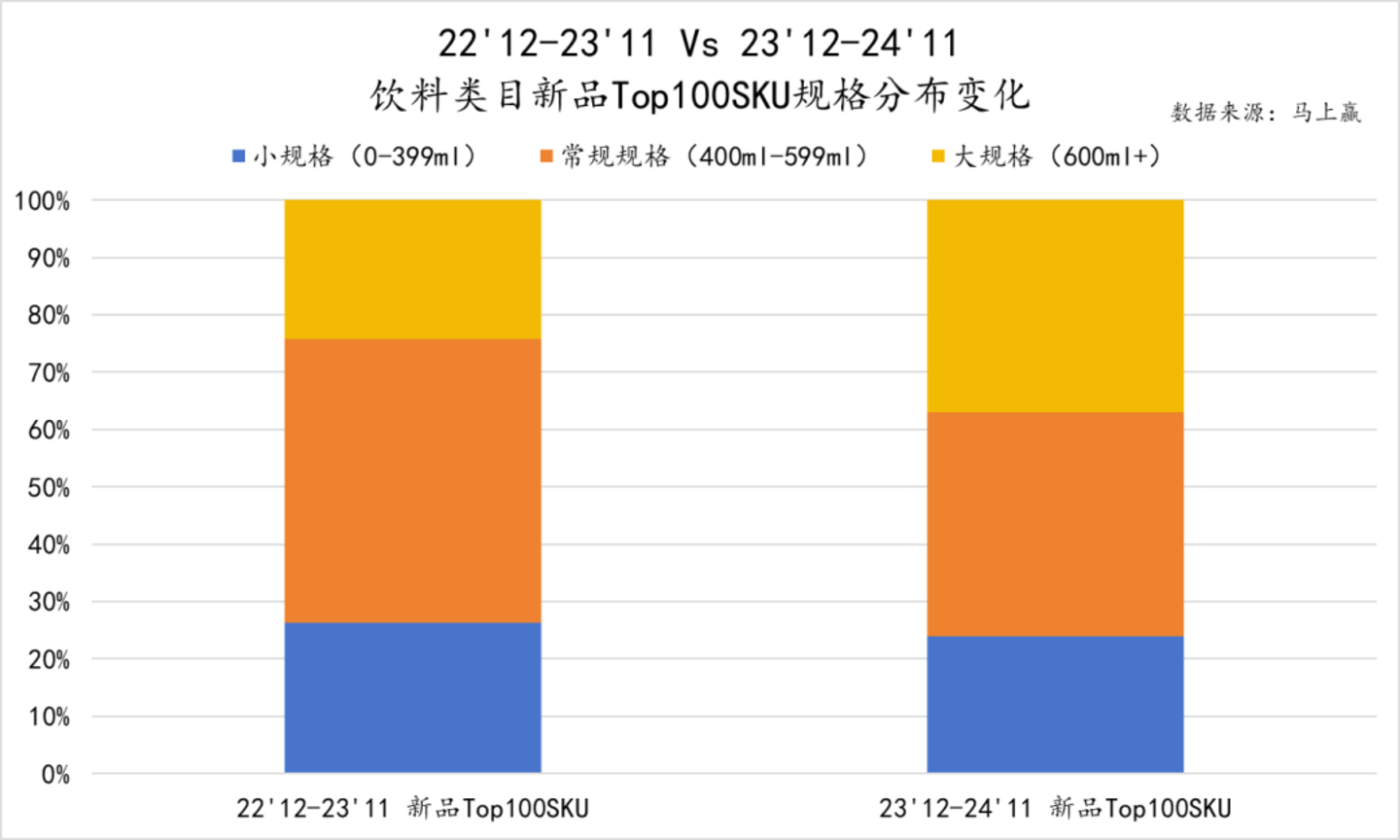 对比22'12-23'11与23'12-24'11,新品TOP 100 SKU的规格带分布情况,可以看到在近一年的TOP 100 SKU中,在小规格占比变化不大的情况下,大规格占比明显更高,相应受到挤压的则主要是常规规格,也即传统意义上饮料市场中占比最高,也是最基本的规格带。