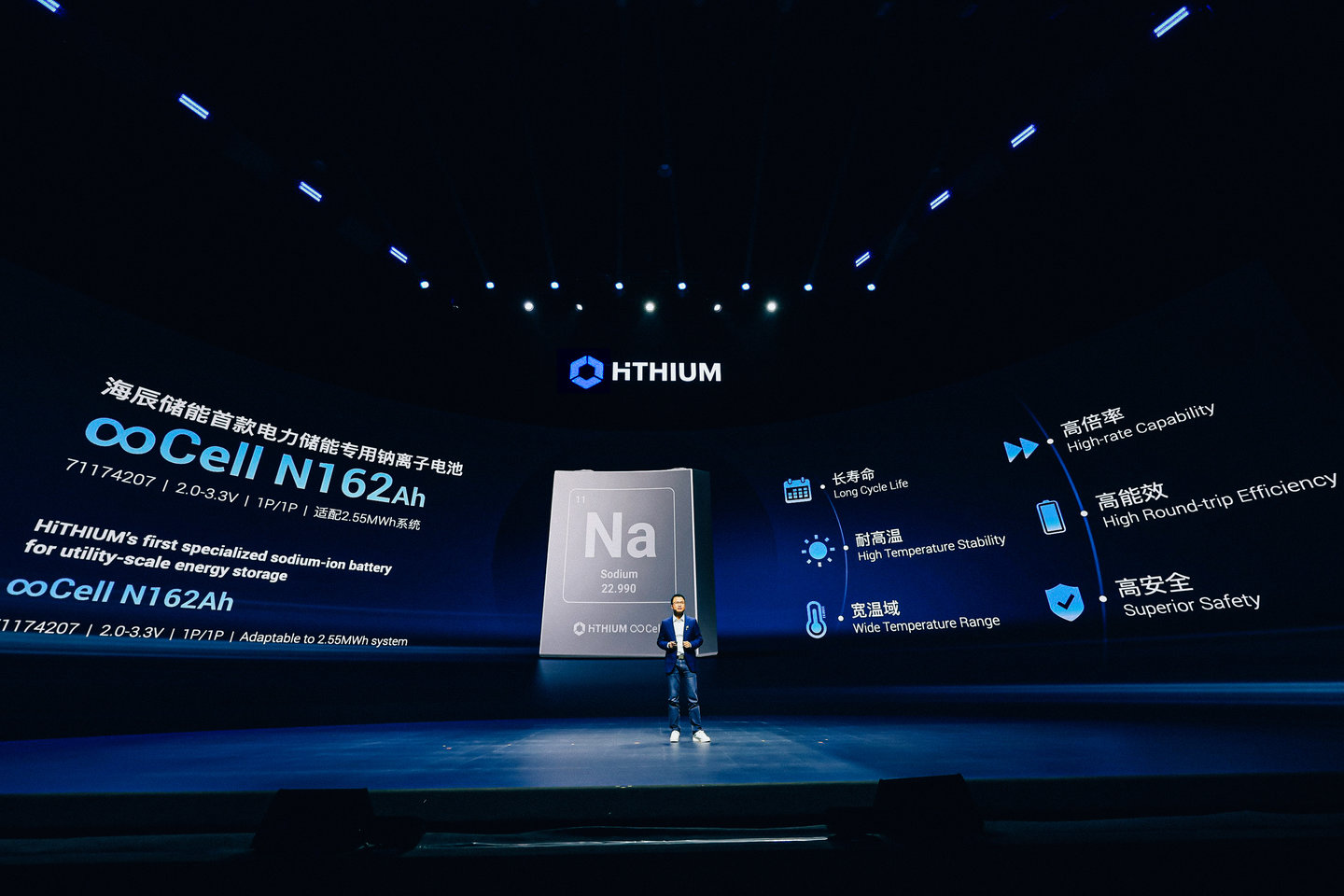 发布会现场,海辰储能正式推出了历时三年研发打造的全球首款电力储能专用钠离子电池∞Cell N162Ah,据郑建明介绍,该产品预计将于明年第四季度实现GWh量产。