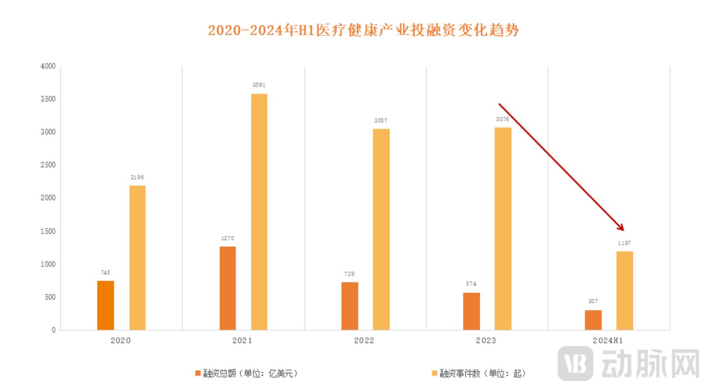 图1.2020-2024年H1医疗健康产业投融资变化趋势(数据来源:动脉橙)