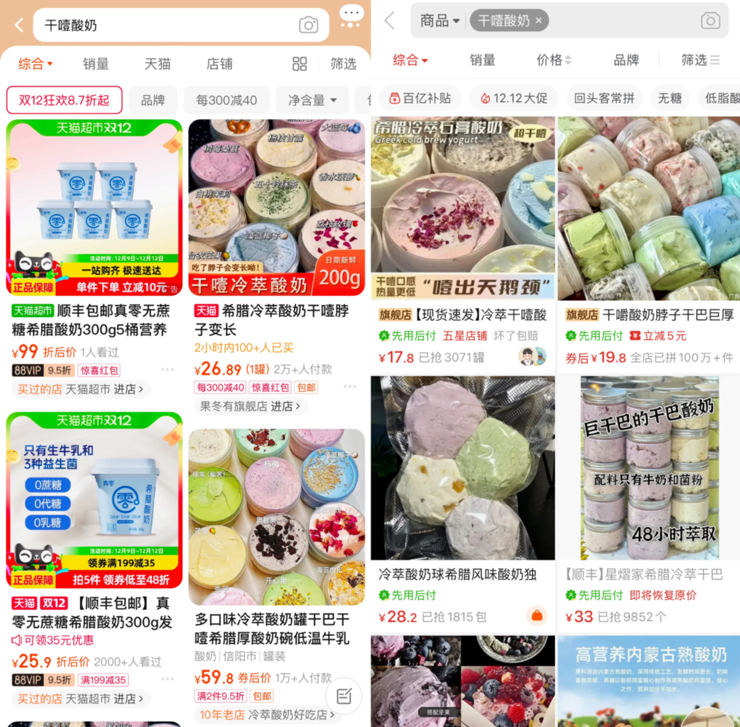 图:电商平台上的干噎酸奶 来源:淘宝(左)、拼多多(右),《听筒Tech》截图
