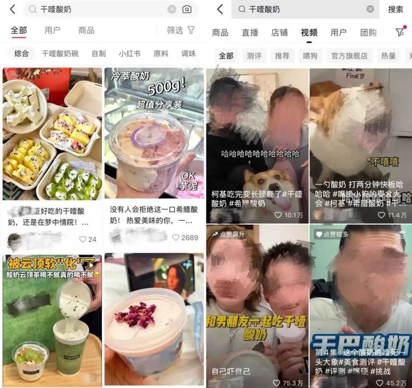 图:社交平台上的干噎酸奶 来源:小红书(左)、抖音(右),《听筒Tech》截图