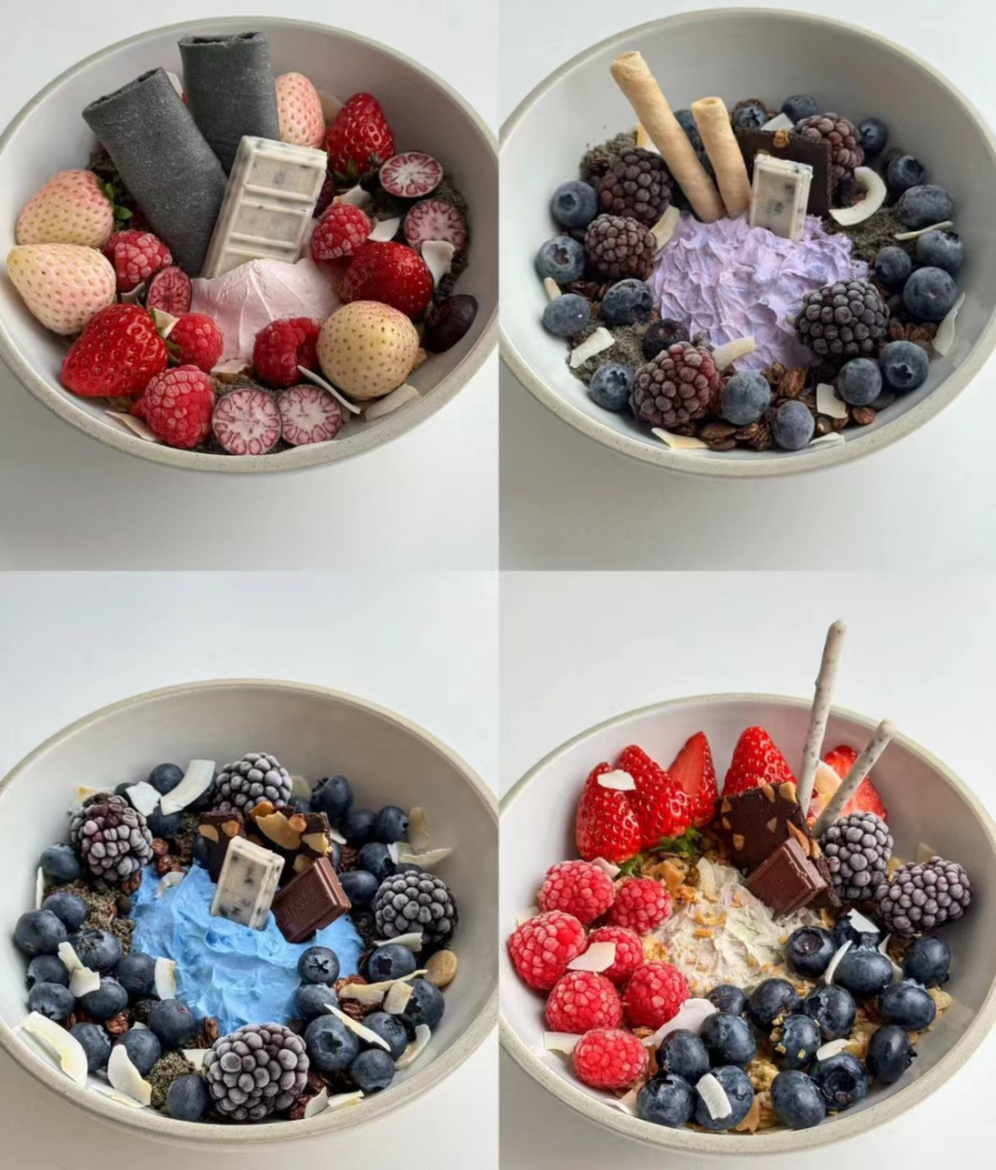 为了让视频更好看,博主们也玩出了新花样,他们选择了甜菜根粉、羽衣甘蓝粉、藻蓝粉等,主打“抗炎”。同时,还将抹茶粉、黑芝麻糊、竹炭粉和酸奶混合,让酸奶碗的美丽分加值。
