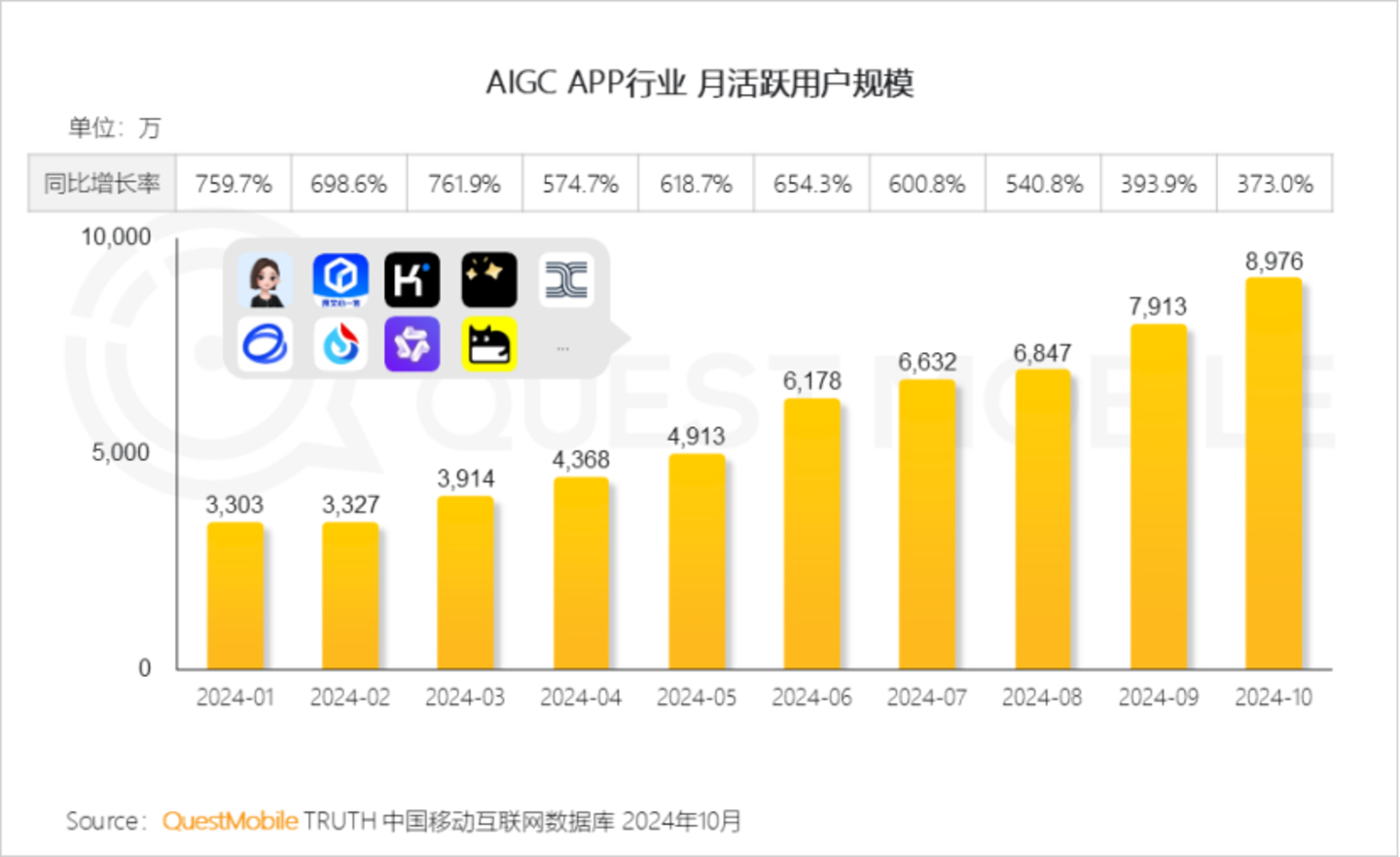 据QuestMobile数据,截止2024年10月,在移动端AI原生应用方面,豆包、Kimi智能助手、文小言月活跃用户分别为4839万、1650万、1179万。
