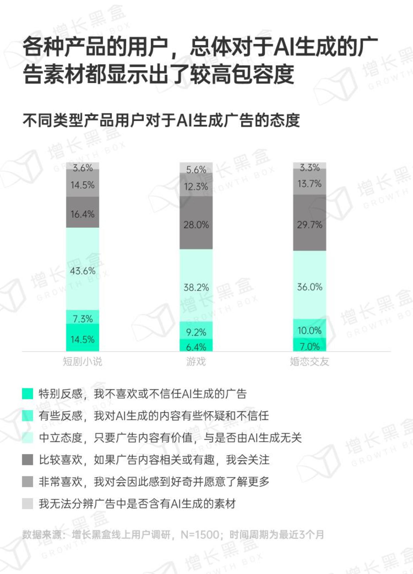 我们发现几乎所有用户都对于内容创意中的“AI味”有所感知,但4成的玩家选择积极拥抱,另外4成则持有中立态度。厂商在广告营销中的AI内容,总体上是能够被玩家群体顺利接受的。不过短剧小说用户对于AI的接受程度相对其它两类更低。