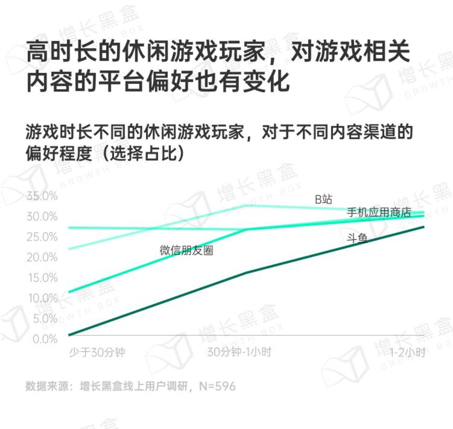 考虑到休闲游戏变现的方式多以广告(IAA)为主,那么玩家的价值用游戏内时长来衡量更合适。数据显示,休闲游戏时长更高的玩家,更偏好B站、手机应用商店、微信朋友圈、斗鱼。