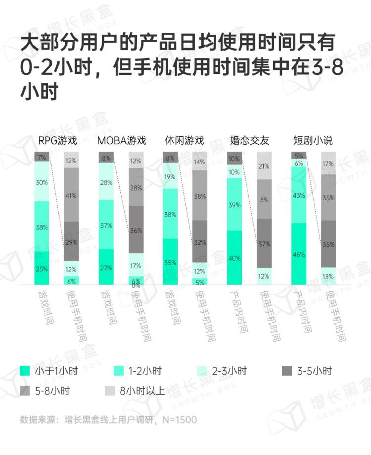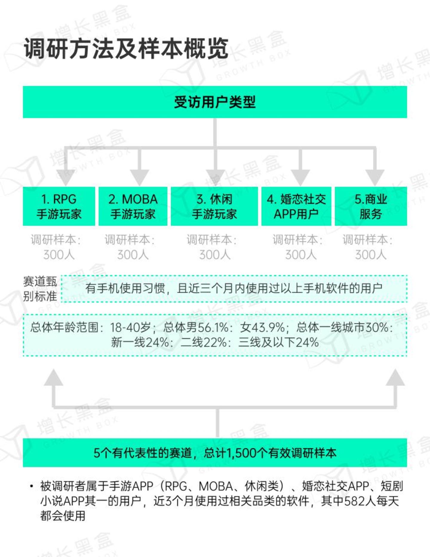 这里选取了市场规模最大的三类手游(RPG、MOBA、休闲益智),以及两类热门的网络服务应用(婚恋交友、短剧小说)进行调研。